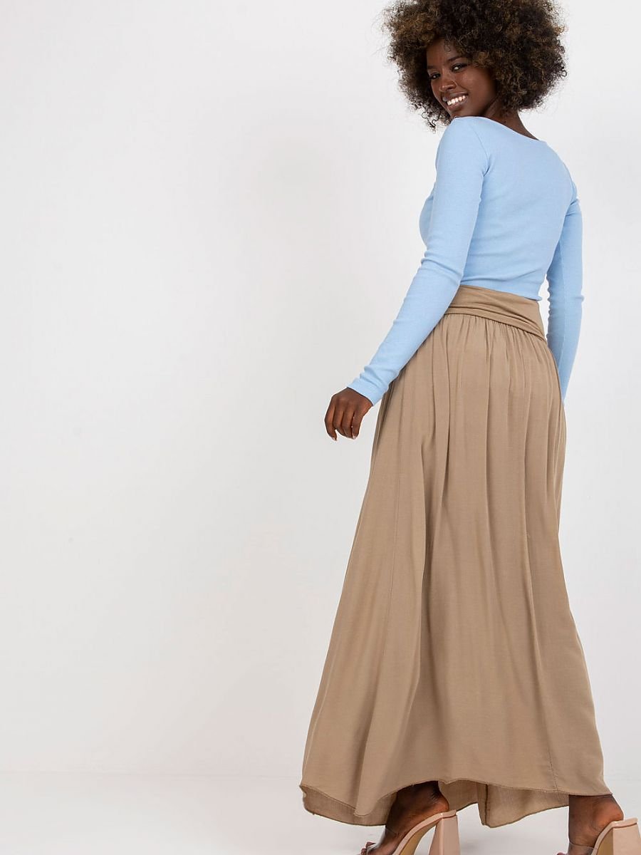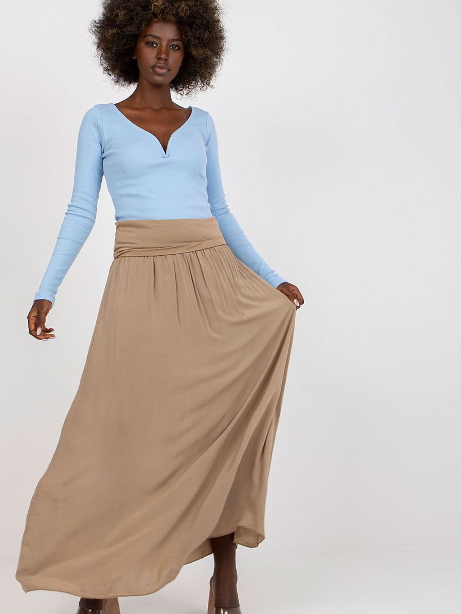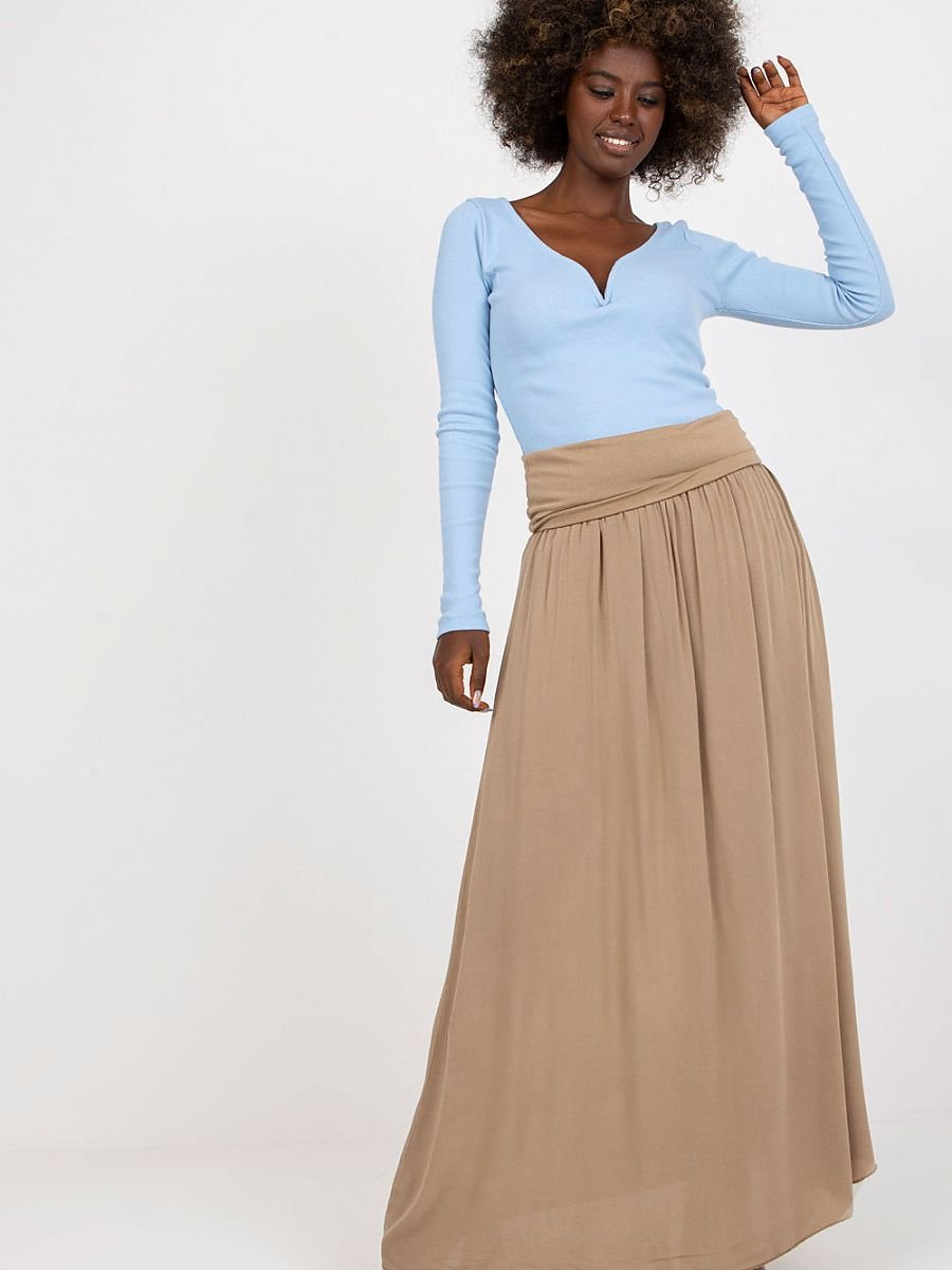 Casualowa spódnica maxi, którą można nosić również jako sukienkę, idealna na co dzień. Wykonana z gładkiego, jednolitego materiału, dominującego wiskozą, zapewnia komfort i przewiewność. Spódnica posiada podszewkę, która dodaje jej objętości i elegancji. Ozdobne marszczenia nadają jej wyjątkowego charakteru i stylu. Dzięki uniwersalnemu fasonowi można ją stylizować na różne sposoby, zarówno jako spódnicę, jak i sukienkę. To wszechstronny element garderoby, idealny na codzienne wyjścia, łączący wygodę z modnym wyglądem.