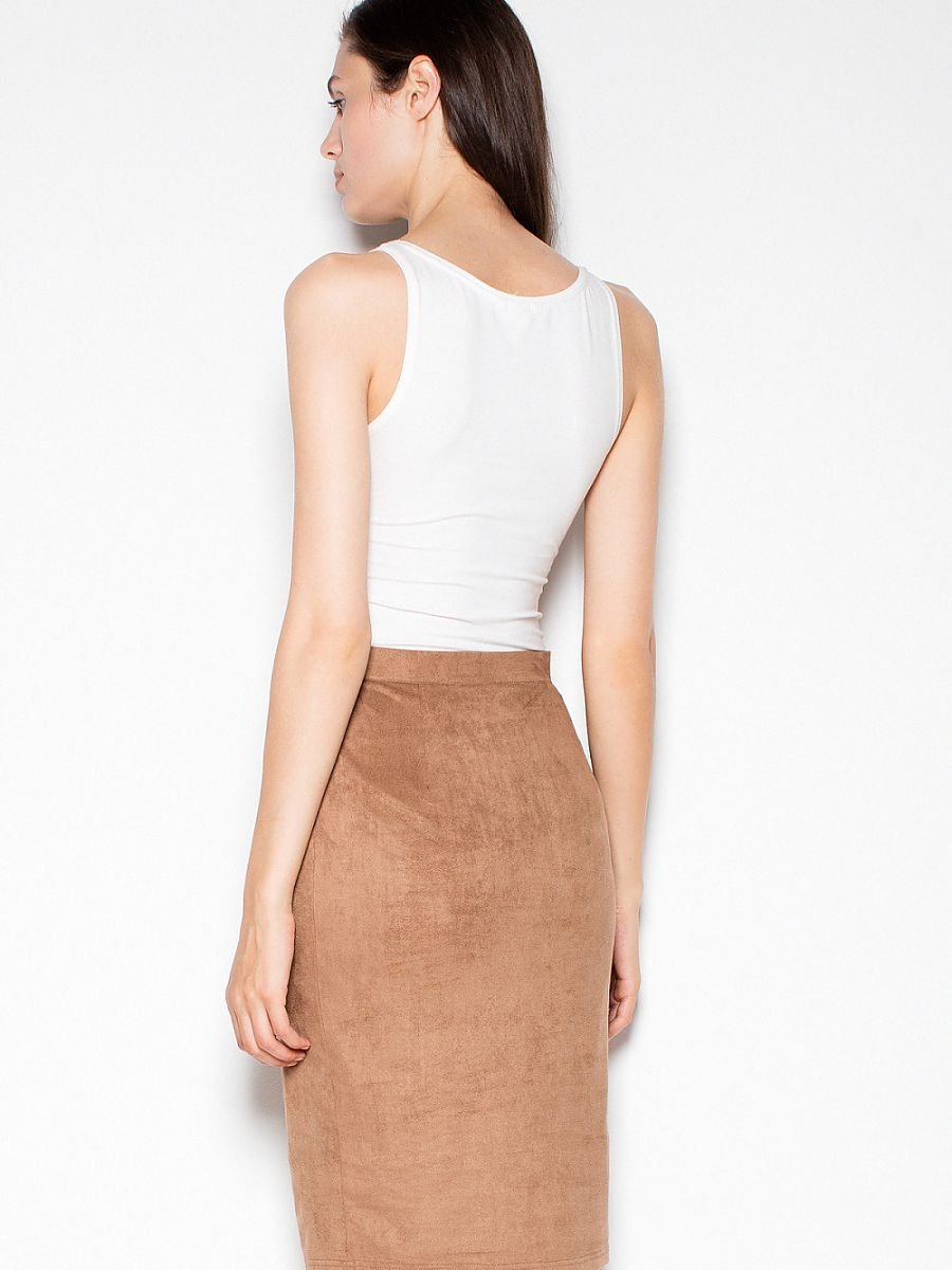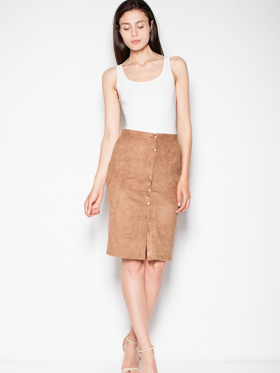 Zamszowa, ołówkowa spódnica w modnej długości midi. Charakterystycznym wyróżnikiem spódnicy jest rząd ozdobnych guzików biegnących wzdłuż spódnicy.