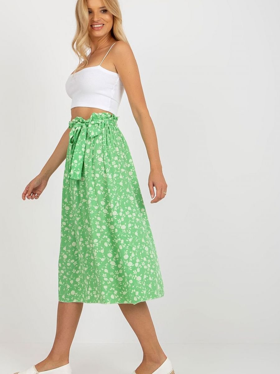 Rozkloszowana spódnica z materiału w kwiaty. W pasie spódnica posiada wiązanie.