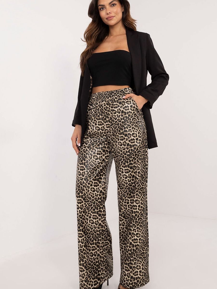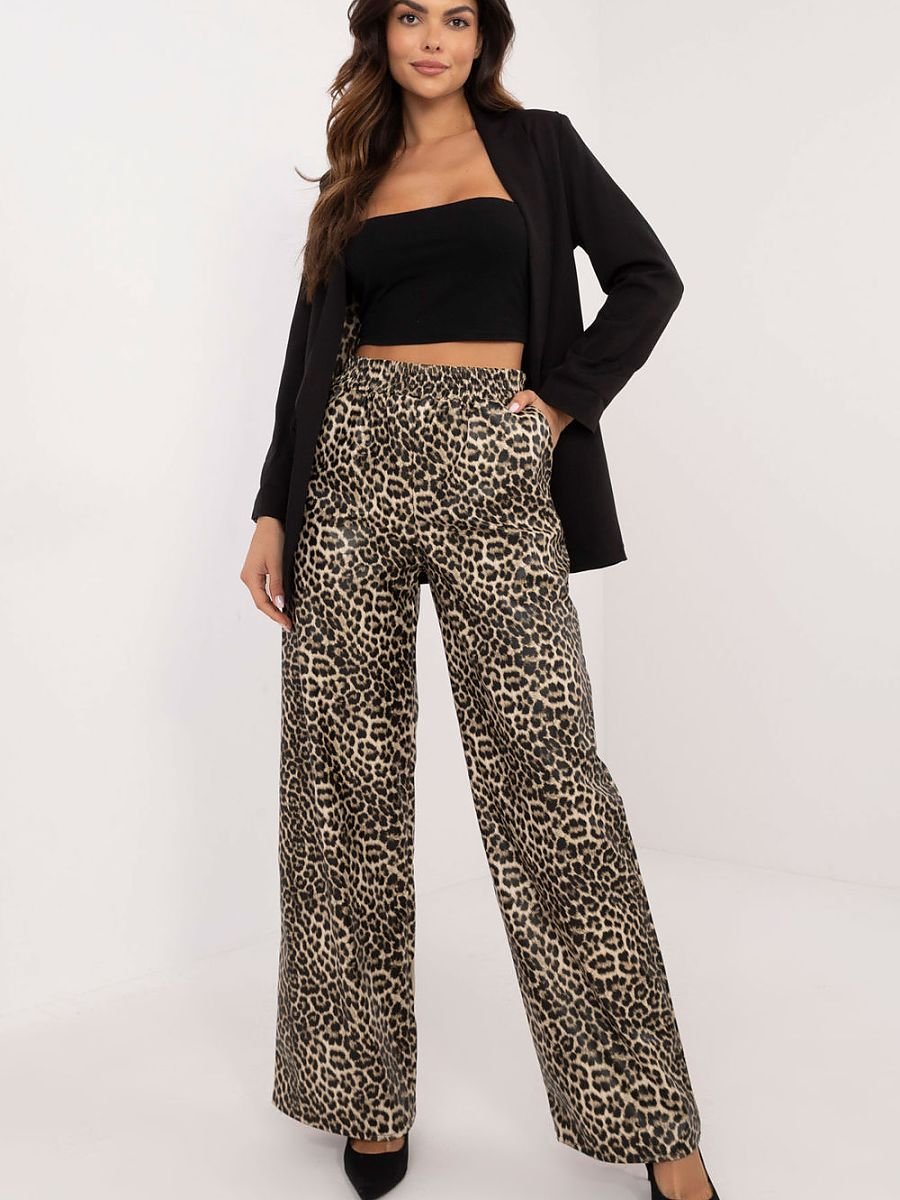 Spodnie z ekoskóry o casualowym i eleganckim stylu, idealne na co dzień oraz do pracy. Wykonane z połączenia poliestru i elastanu, zapewniają komfort noszenia oraz elastyczność, a ich wysoki stan podkreśla talię. Dominujący motyw zwierzęcy dodaje im oryginalności i modowego akcentu. Spodnie mają proste nogawki, co sprawia, że są uniwersalne i łatwe do zestawienia z różnymi stylizacjami. Brak zapięcia oraz gumowy pas zapewniają wygodę i łatwość zakładania, a boczne, wsuwane kieszenie dodają funkcjonalności. Idealny wybór dla osób ceniących sobie styl i komfort!