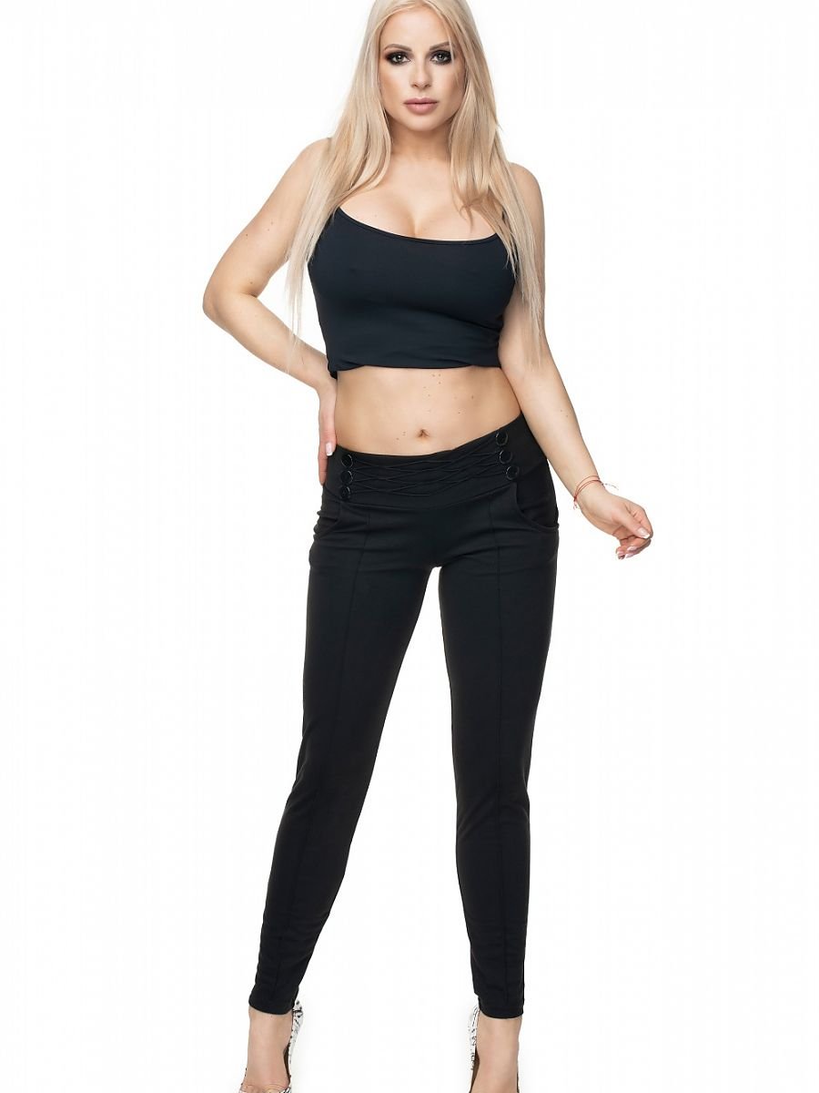 Spodnie o dopasowanym kroju z ozdobnymi guzikami. Idealna propozycja na wiele okazji. Spodnie z kieszeniami wsuwanymi.