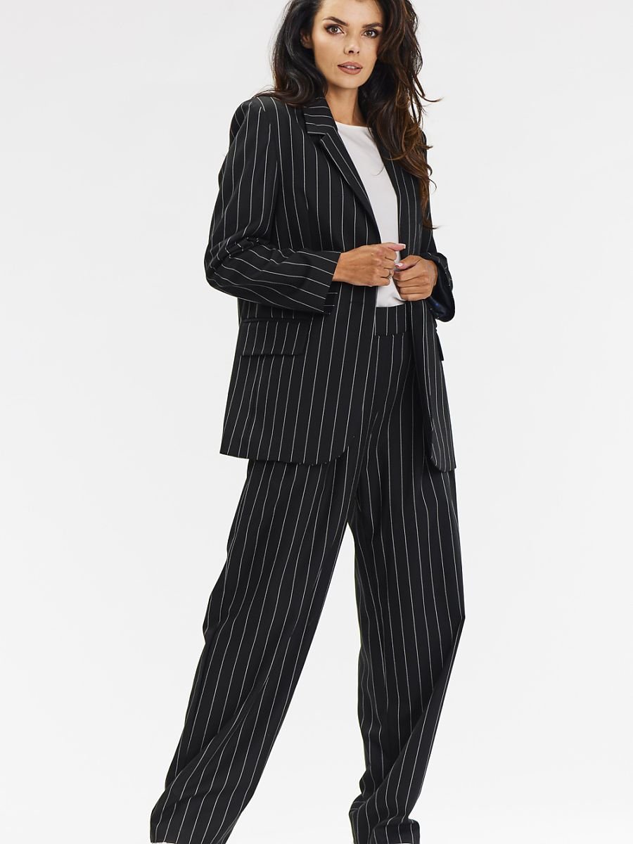 Eleganckie spodnie z szerokimi nogawkami. Dodaj do swojej garderoby eleganckie spodnie o szerokich nogawkach w czarnym kolorze z białym prążkiem. Idealne na różne okazje, od biura po codzienne stylizacje. Spodnie marki Awama łączą klasyczny styl z nowoczesnym akcentem, oferując wygodę i elegancję. Spodnie wyróżniają się szerokimi nogawkami, które dodają lekkości każdej stylizacji. Gumka w talii zapewnia komfort i dopasowanie. Materiał z wiskozą jest miękki i przyjemny w dotyku, a prążkowany wzór dodaje nowoczesnego charakteru. Te wszechstronne spodnie świetnie komponują się z koszulami, bluzkami czy casualowymi t-shirtami. Idealnie pasują do szpilek, kozaków i sneakersów, tworząc zarówno eleganckie, jak i casualowe zestawy.