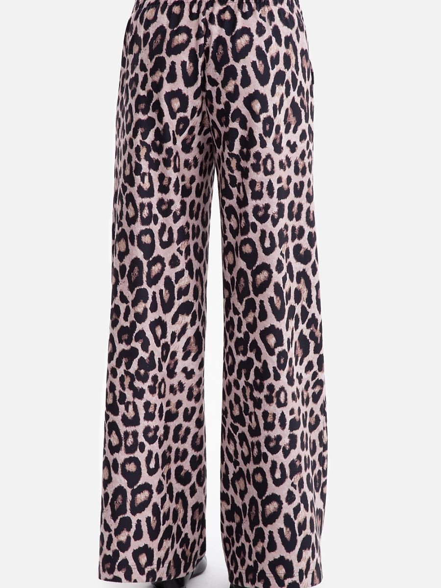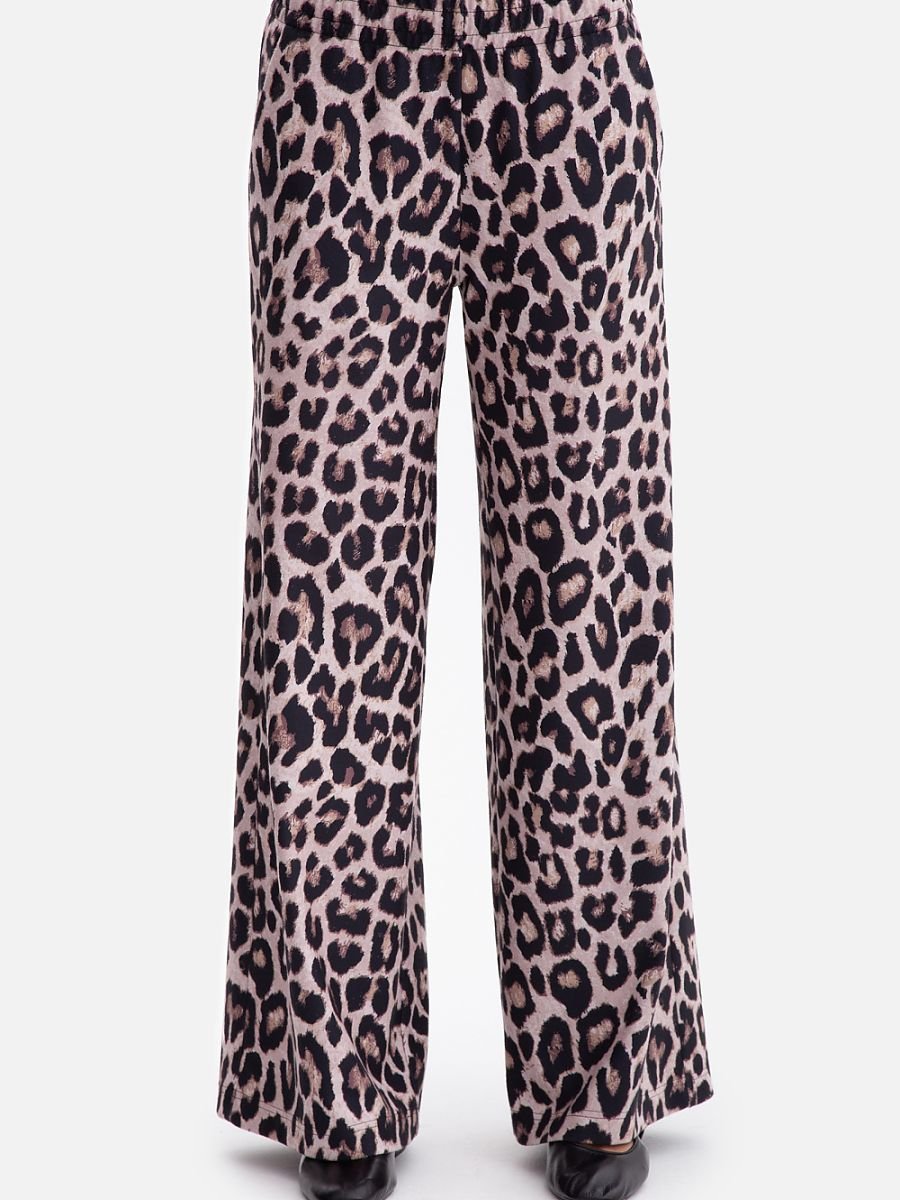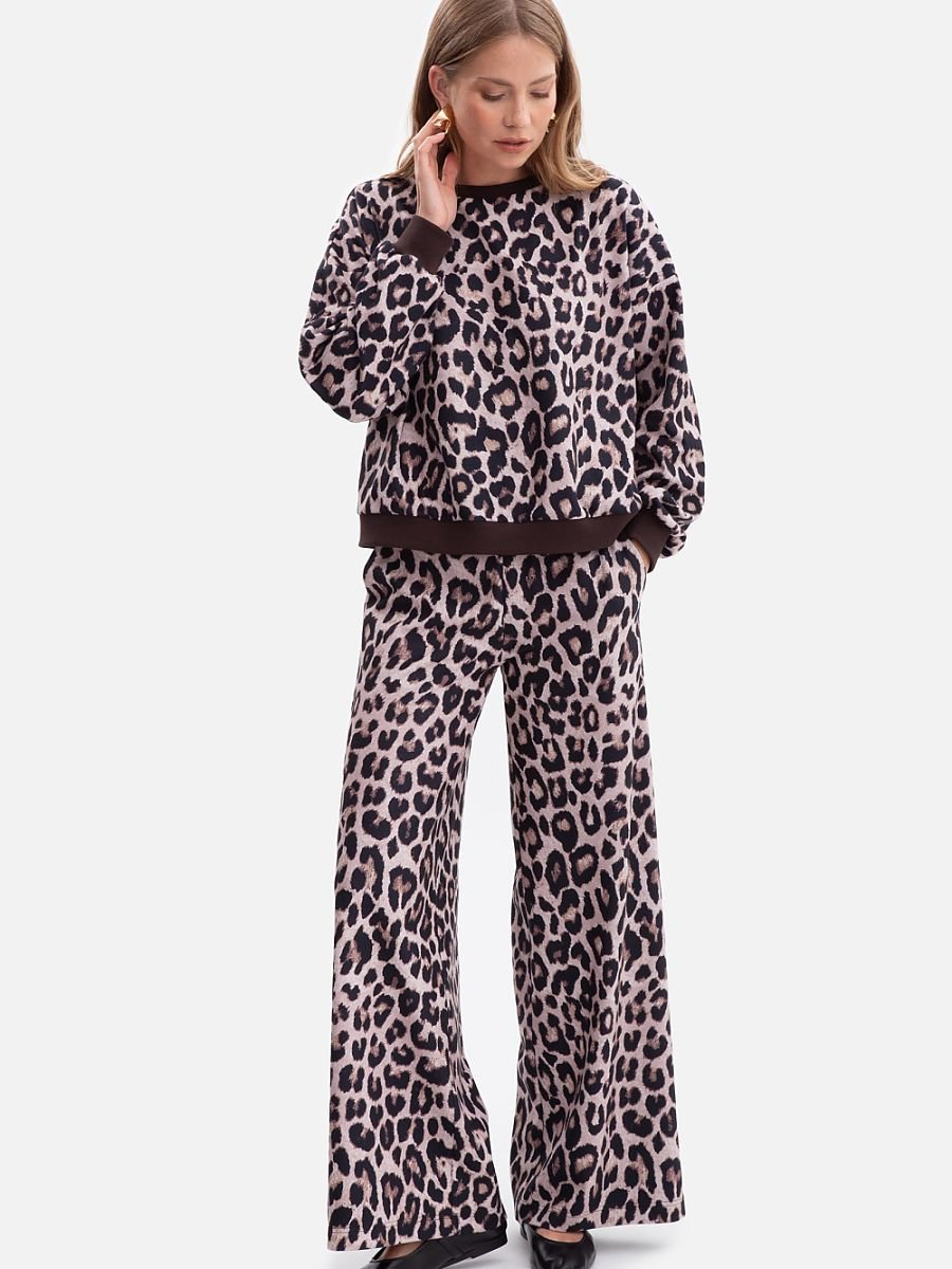 Spodnie damskie wykonane z miękkiej, drapanej dzianiny z nadrukiem, o przyjemnej w dotyku powierzchni z delikatnym włoskiem. Materiał zapewnia komfort i ciepło, a jednocześnie jest lekki i elastyczny. Model bez kieszeni i podszewki, z praktyczną gumką w pasie, która dopasowuje się do sylwetki. Fason luźny, casualowy, spodnie są dopasowane w talii i biodrach, a od uda w dół przechodzą w szerokie, proste nogawki, które swobodnie opadają, tworząc efekt lekkości i wydłużając nogi. Średni stan podkreśla talię i zapewnia wygodę w codziennym noszeniu. Pełna długość, sięgająca do ziemi, sprawia, że spodnie prezentują się elegancko i nowocześnie, a przy tym świetnie komponują się z casualowymi i sportowymi stylizacjami. Zaprojektowane i uszyte w Polsce z dzianiny wyprodukowanej w Łodzi, to gwarancja jakości, wygody i unikatowego stylu.