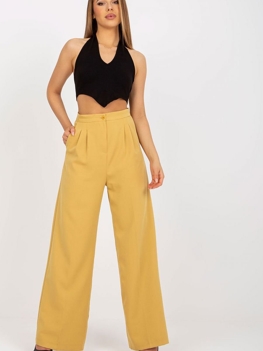 Długie spodnie damskie z wysokim stanem, zapinane na zamek i guzik. Po bokach kieszenie wsuwane. Idealne do wielu stylizacji.