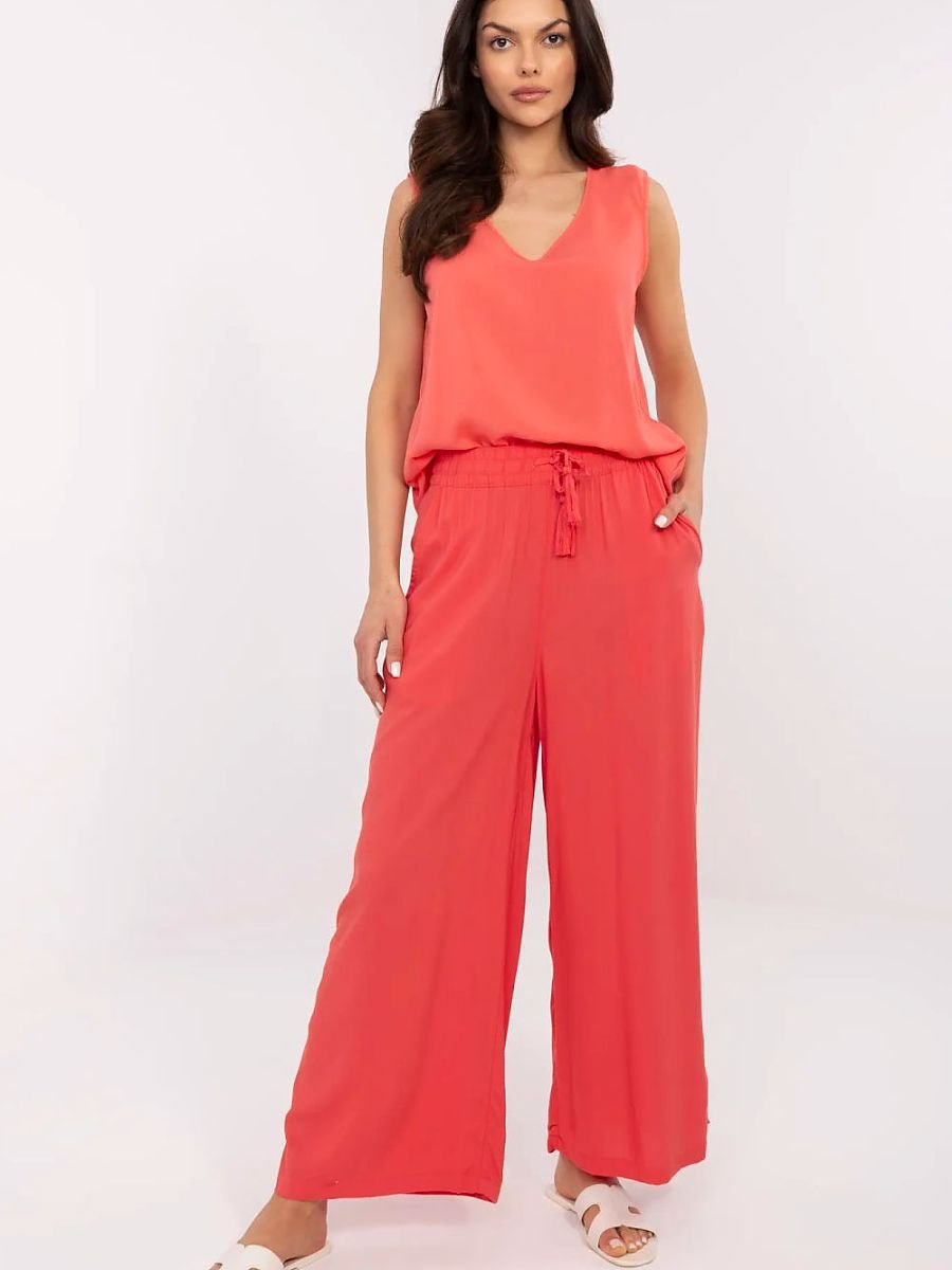 Spodnie palazzo to idealny wybór na codzienne stylizacje, łączący wygodę z elegancją. Wykonane z wiskozy, zapewniającej miękkość i przewiewność, doskonale sprawdzą się zarówno w cieplejsze dni, jak i podczas chłodniejszych wieczorów. Szerokie nogawki nadają im luźny, nonszalancki wygląd, który świetnie wpisuje się w casualowy styl. Dodatkowym atutem są praktyczne wsuwane kieszenie, które zwiększają funkcjonalność spodni. Wysoki stan podkreśla talię i wydłuża optycznie sylwetkę, co sprawia, że spodnie te są bardzo korzystne dla każdej figury. Troczki do wiązania pozwalają na idealne dopasowanie do talii, a brak zapięcia gwarantuje komfort noszenia. Proste, jednolite wzornictwo czyni te spodnie wszechstronnym elementem garderoby, który można łatwo łączyć z różnorodnymi topami i akcesoriami. To uniwersalna propozycja dla kobiet ceniących sobie modę i wygodę na co dzień.