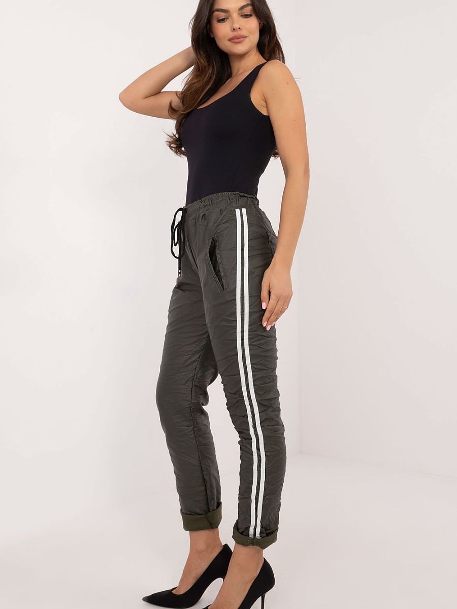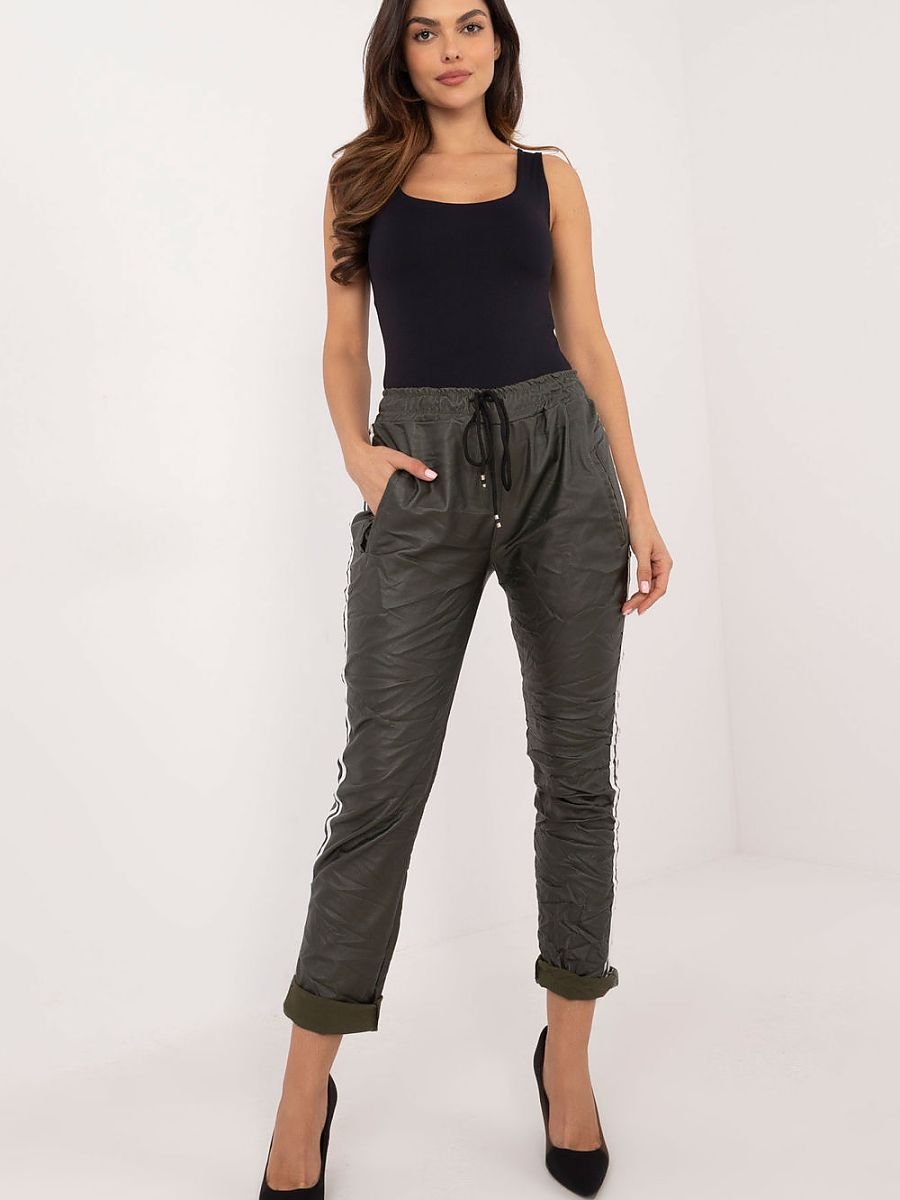 Damskie spodnie z ekoskóry to doskonały wybór dla miłośniczek casualowego stylu, idealne na co dzień oraz do pracy. Wykonane z wysokiej jakości mieszanki wiskozy, poliestru i elastanu, zapewniają wygodę oraz elastyczność, a ich gładki wzór nadaje im nowoczesny charakter. Wysoki stan doskonale podkreśla talię, a zwężane nogawki optycznie wydłużają sylwetkę. Spodnie wyposażone są w praktyczne boczne kieszenie wsuwane, które są idealne do przechowywania drobiazgów. Dodatkowo, wiązanie w pasie pozwala na indywidualne dopasowanie, a stylowe lampasy po bokach nogawek nadają całości sportowego, a zarazem eleganckiego wyglądu. To uniwersalny element garderoby, który można łączyć z różnymi topami i dodatkami, tworząc niepowtarzalne stylizacje.