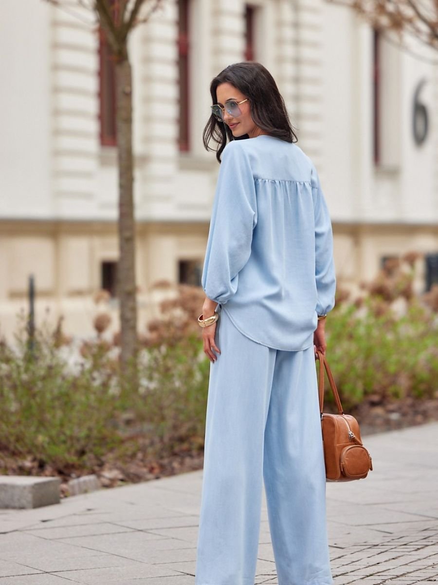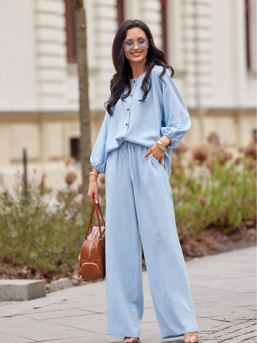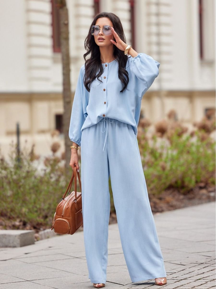 Spodnie damskie z długimi nogawkami. Wiązana góra high waist i długie, szerokie nogawki. Spodnie posiadają boczne, otwarte kieszenie i gumkę w pasie.