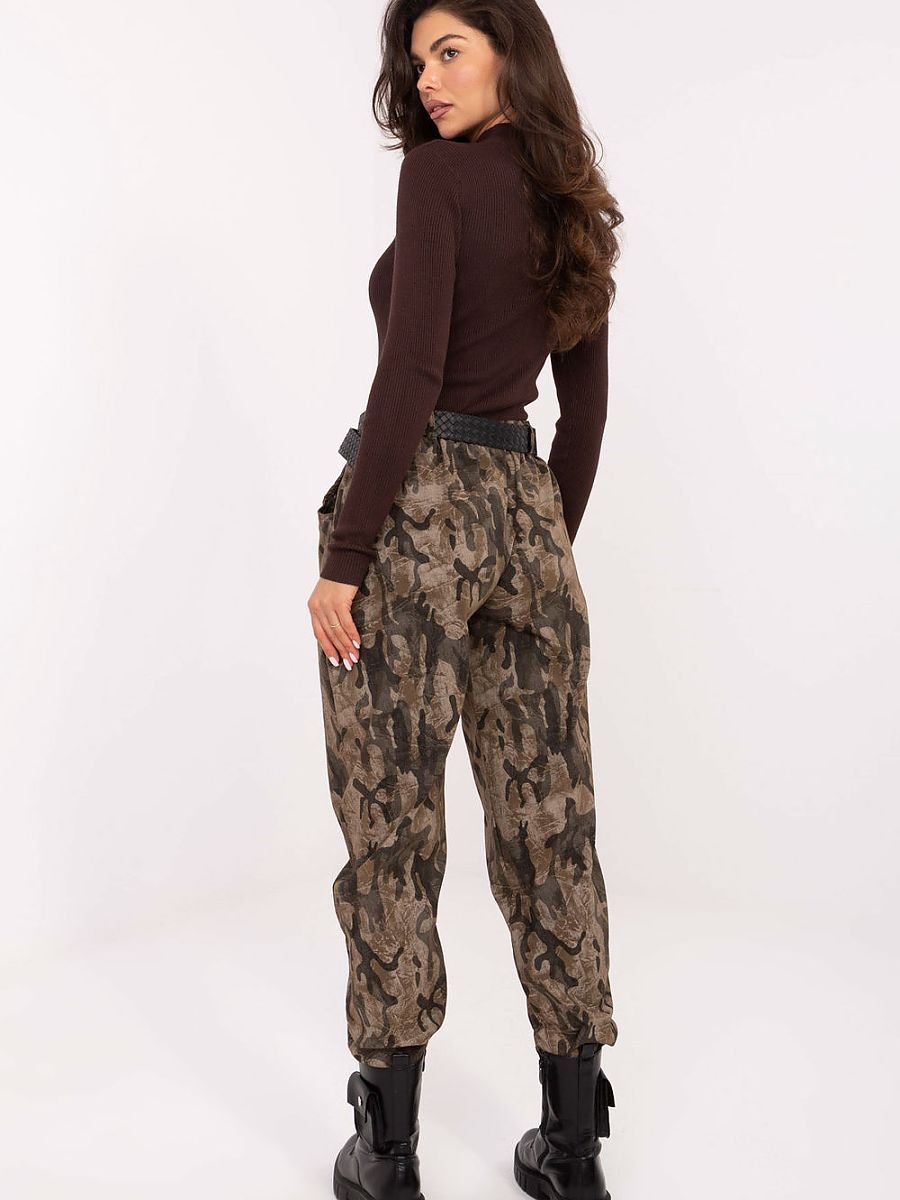 Damskie spodnie materiałowe w stylu casual, idealne na co dzień. Wykonane z mieszanki wiskozy, poliestru i elastanu, łączą wygodę z elastycznością i trwałością. Model z wysokim stanem, zwężanymi nogawkami i gumą w pasie zapewnia komfort noszenia, a zapinany pasek podkreśla talię. Boczne wsuwane kieszenie oraz modny wzór moro na całym materiale nadają spodniom nowoczesnego, wyrazistego charakteru.
