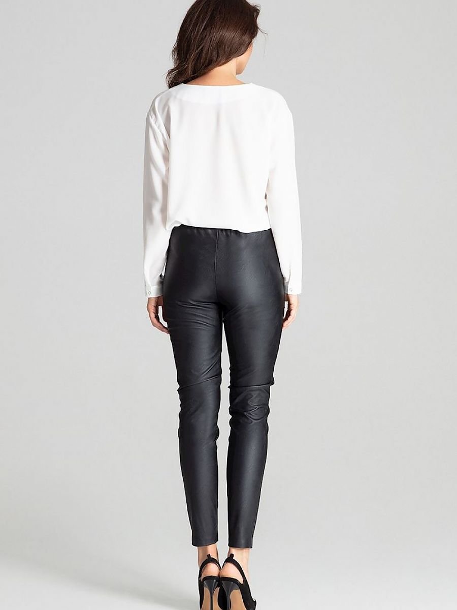Czarne dopasowane spodnie z eko-skóry. W pasie, z tyłu wszyta szeroka guma. Z przodu duże naszywane kieszenie.