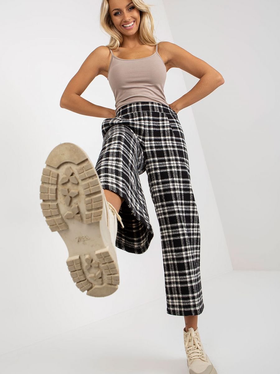 Spodnie damskie z materiału w kratę, zapinane na kryty zamek. Po bokach kieszenie wsuwane. Idealna propozycja na wiele okazji.