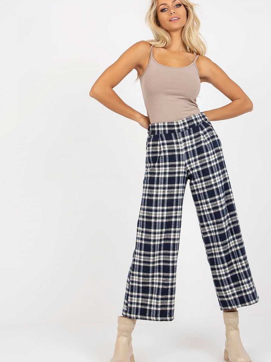 Spodnie damskie z materiału w kratę, zapinane na kryty zamek. Po bokach kieszenie wsuwane. Idealna propozycja na wiele okazji.