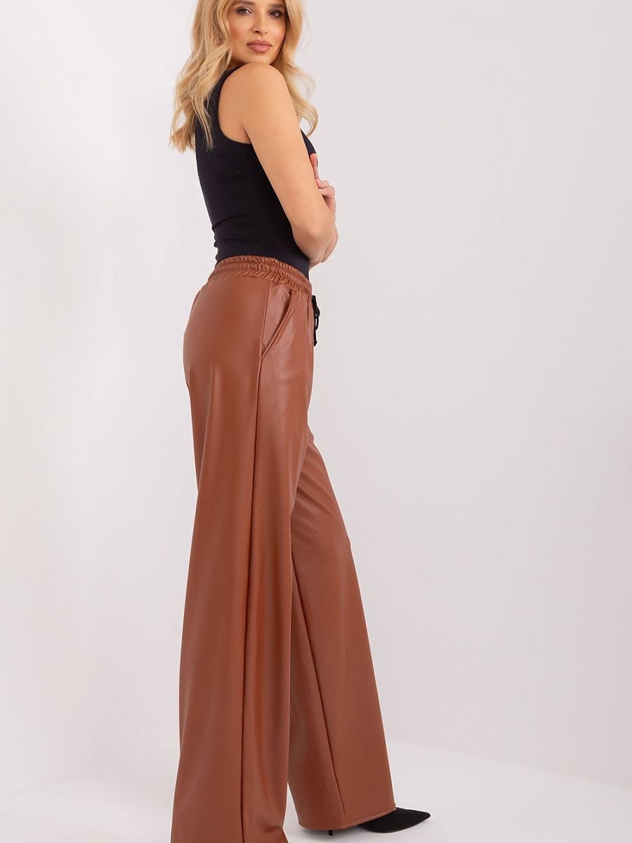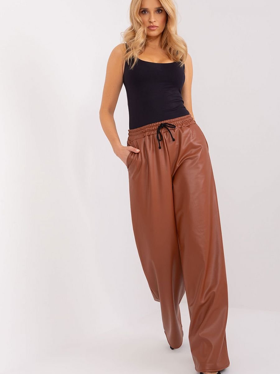 Długie spodnie wykonane z ekologicznej skóry z ociepleniem. Spodnie z wysokim stanem oraz wiązaniem, po bokach kieszenie wsuwane. Propozycja na wiele okazji.