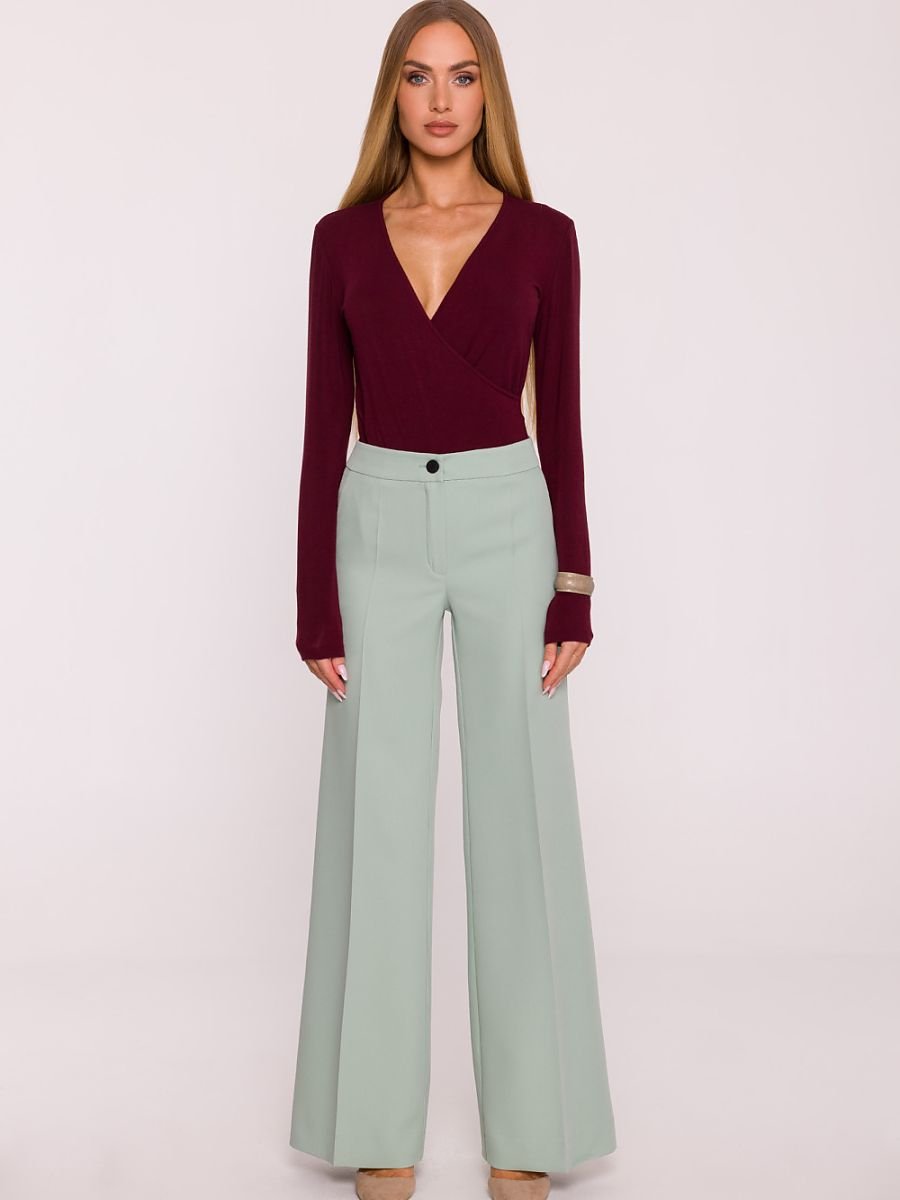 Klasyczne spodnie damskie uszyte z gładkiej tkaniny garniturowej o matowym wykończeniu to elegancka i ponadczasowa propozycja do wielu stylizacji. Materiał zachowuje strukturę, a zaprasowane na kant nogawki dodają całości wyrafinowanego charakteru. Model o średnim stanie dopasowuje się w talii i biodrach, a szeroka nogawka od uda w dół zapewnia komfort noszenia i swobodę ruchu. Zapięcie na guzik i kryty zamek z przodu gwarantuje wygodę, a boczne kieszenie dodają funkcjonalności. Spodnie sięgają do ziemi, co w połączeniu z szeroką nogawką optycznie wydłuża sylwetkę i podkreśla elegancki charakter całej stylizacji. Brak podszewki sprawia, że model pozostaje lekki i komfortowy w noszeniu. Zaprojektowane i uszyte w Polsce, dla kobiet, które cenią klasykę, wygodę i doskonałe wykonanie.