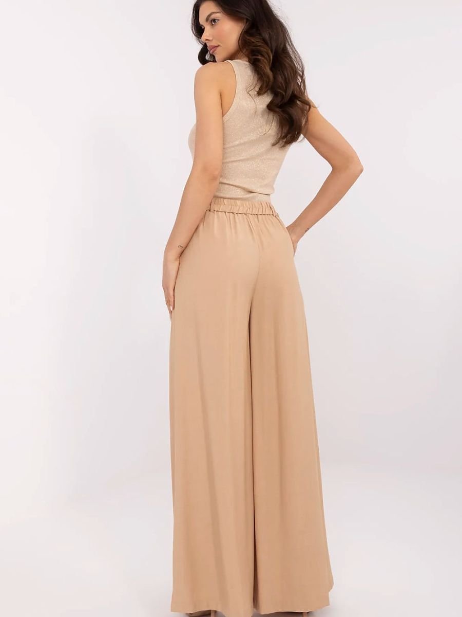 Eleganckie i stylowe spodnie damskie typu palazzo, które doskonale sprawdzą się zarówno na co dzień, do pracy, jak i na wizytowe okazje. Wykonane z wysokiej jakości wiskozy, zapewniają lekkość, przewiewność i komfort noszenia. Gładki materiał podkreśla ich klasyczny charakter, a szerokie nogawki dodają elegancji i swobody ruchu. Wysoki stan pięknie podkreśla talię, a praktyczne wsuwane kieszenie boczne dodają funkcjonalności. Spodnie zapinane są na guzik oraz kryty zamek, co gwarantuje idealne dopasowanie i estetyczne wykończenie. To ponadczasowy model, który świetnie komponuje się z koszulami, bluzkami i eleganckimi marynarkami.