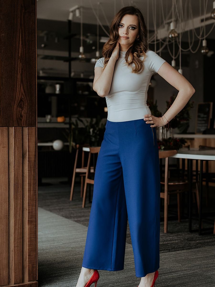 Spodnie damskie o długości 7/8 z szerokimi nogawkami. Spodnie zapinane na ozdobny zamek. Propozycja idealna na wiele okazji.