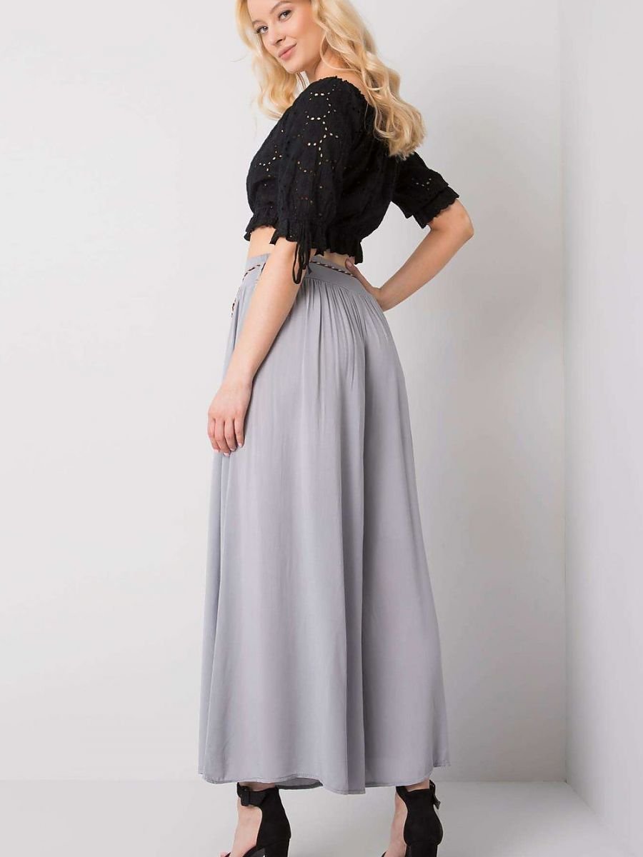 Materiałowe spodnie z szerokimi nogawkami, w pasie gumka. Spodnie w komplecie mają ozdobny pasek.