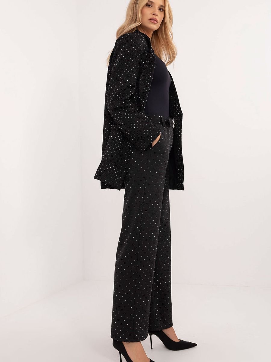 Damskie spodnie materiałowe z błyszczącymi dżetami w formie kropek, które doskonale łączą elegancję z nowoczesnym stylem, idealne na imprezy oraz wizytowe okazje. Wykonane z dominującej wiskozy, spodnie są lekkie i przewiewne, co zapewnia komfort noszenia przez cały dzień. Dzięki wysokiemu stanowi, podkreślają talię i nadają sylwetce elegancki wygląd. Szerokie nogawki dodają im swobody, tworząc modny i luźny fason. Spodnie nie posiadają zapięcia, co sprawia, że są łatwe do zakładania, a kieszenie boczne oferują praktyczność w codziennym użytkowaniu. Dodatkowo, zapinany pasek pozwala na idealne dopasowanie do sylwetki, co czyni te spodnie doskonałym wyborem dla kobiet pragnących wyglądać stylowo na każdej imprezie.