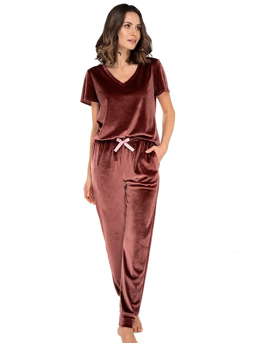 Mega modny, welurowy dres w pięknym, burgundowym kolorze. Idealny jako homewear, wysokiej jakości, bardzo kobiecy. Tkanina średniej grubości, sprawdzi się również pomiędzy sezonami, jest bardzo wygodna i elastyczna. Góra z krótkim rękawem i z dekoltem do szpica. Spodnie długie, luźne, wykończone ściągaczami przy kostkach. W pasie miękka gumka i kokardka. Po bokach kieszenie.