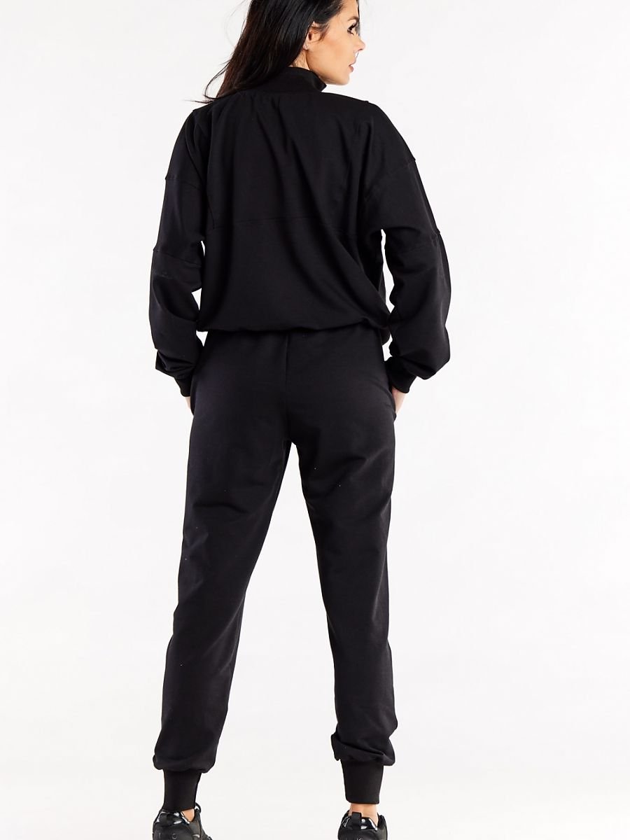 Luźne spodnie z ozdobnymi pionowymi szwami na przodzie nogawek z wszytą gumą w pasie. Po bokach kieszenie wsuwane. Nogawki wykończone ściągaczami.