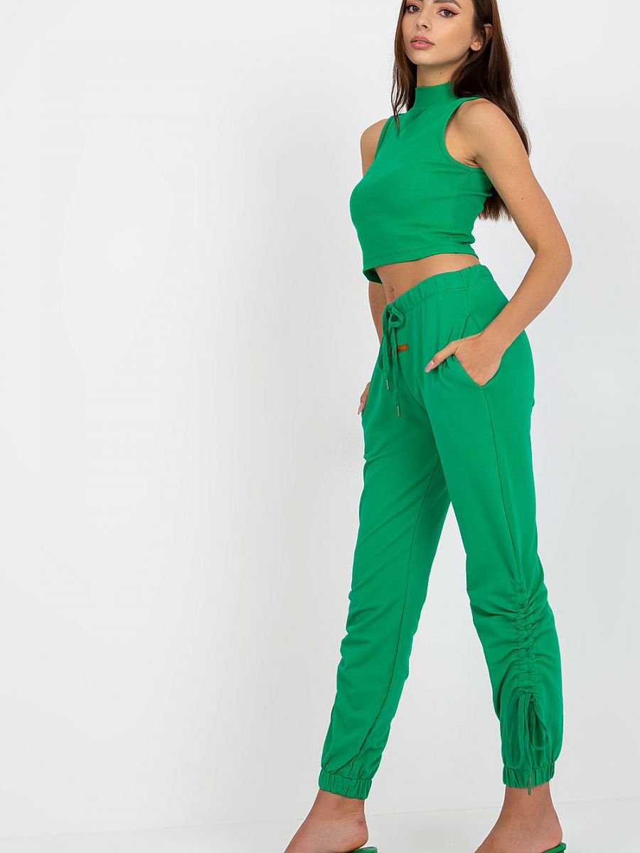 Spodnie dresowe z wysokim stanem, w pasie wiązaniem. Po bokach kieszenie wsuwane. Nogawki zakończone ściągaczami.