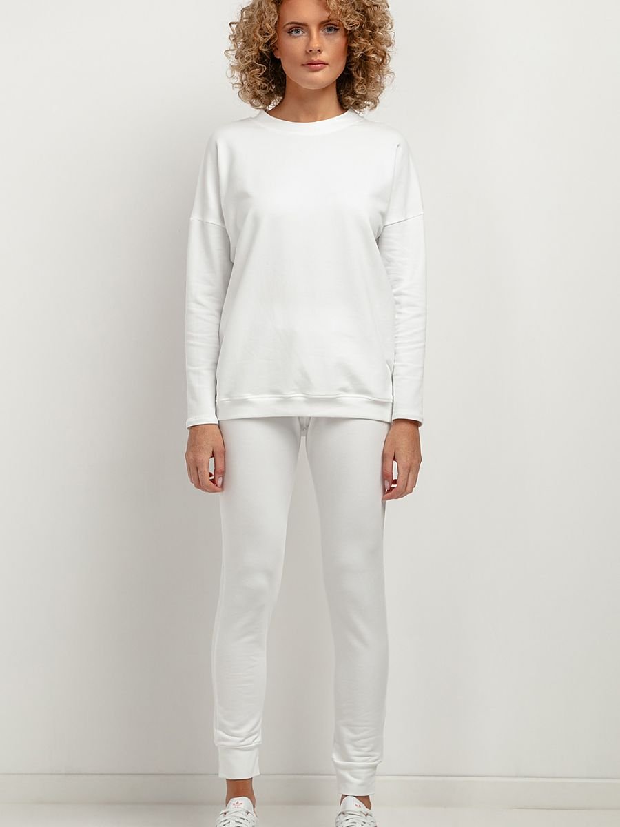 Przylegające spodnie dresowe z miękkiej dzianiny dresowej. Posiadają marszczenie z gumką w pasie i mankiety przy nogawkach, pięknie podkreślając nogi. Spodnie są szyte z dzianiny z certyfikatem OEKO-TE Standard 100.