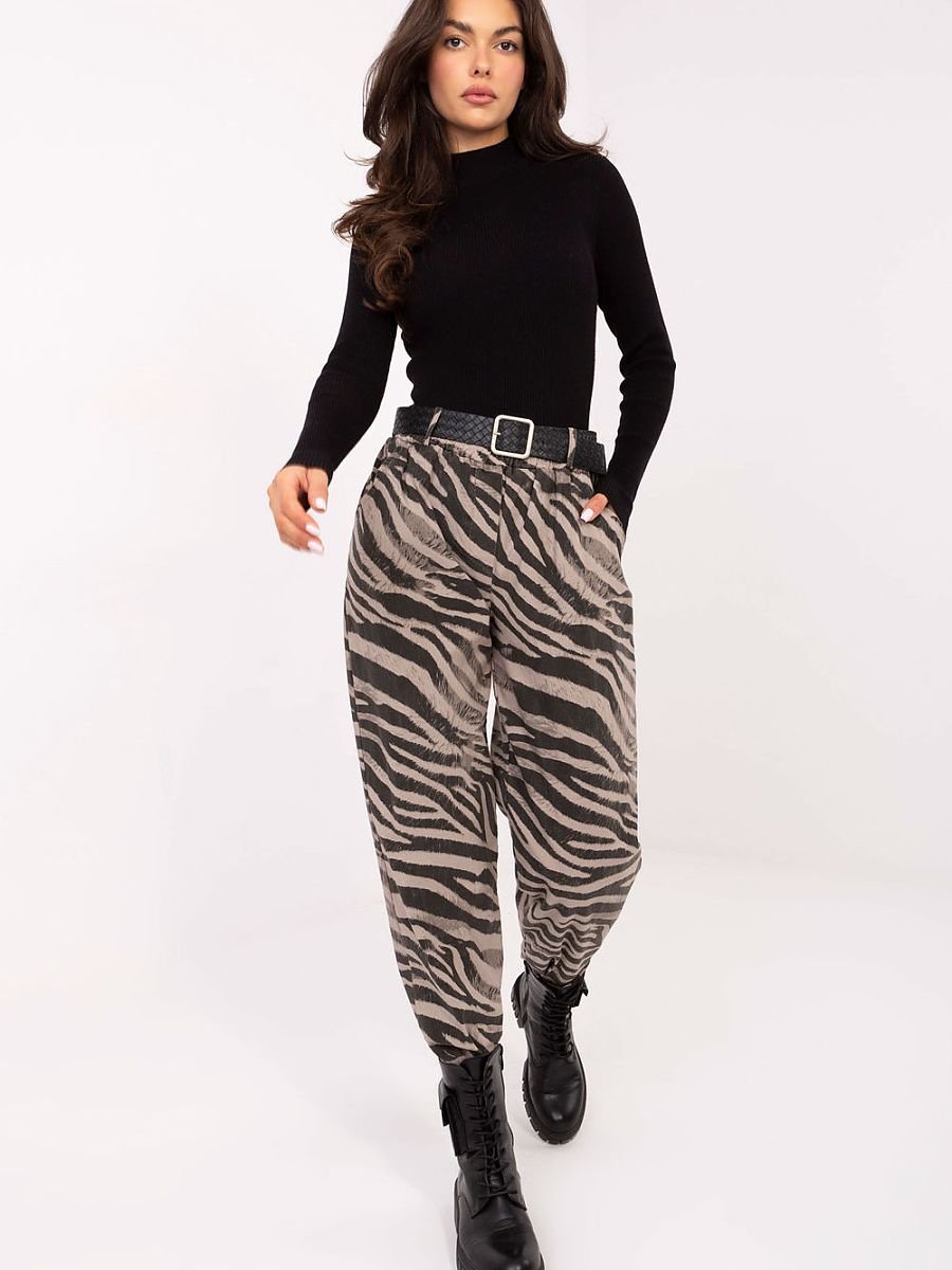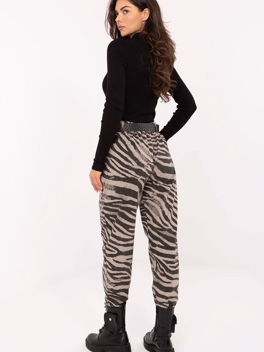 Damskie spodnie materiałowe w stylu casual, idealne na co dzień. Wykonane z mieszanki wiskozy, poliestru i elastanu, łączą wygodę z elastycznością i trwałością. Model z wysokim stanem, zwężanymi nogawkami i gumą w pasie zapewnia komfort noszenia, a zapinany pasek podkreśla talię. Boczne wsuwane kieszenie oraz modny wzór w zebrę na całym materiale nadają spodniom nowoczesnego, wyrazistego charakteru.