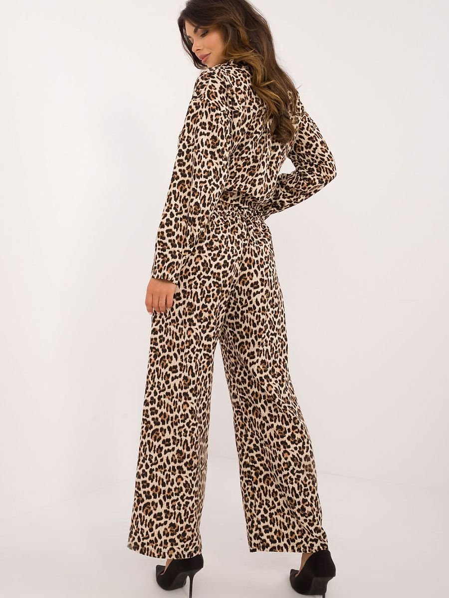 Damski komplet o modnym zwierzęcym motywie, składający się z koszuli i spodni, wykonany z połączenia poliestru i elastanu. Koszula ma długi rękaw i jest zapinana na guziki, co nadaje jej klasycznego charakteru. Dodatkowo wyposażona jest w kołnierzyk, który podkreśla elegancki wygląd. Spodnie są długie, z szerokimi nogawkami, które zapewniają wygodę i swobodę ruchów. Wysoki stan spodni pięknie podkreśla sylwetkę, dodając całości wyrafinowania. Ten komplet to idealny wybór dla kobiet ceniących modę, komfort i odrobinę drapieżnego stylu na co dzień.