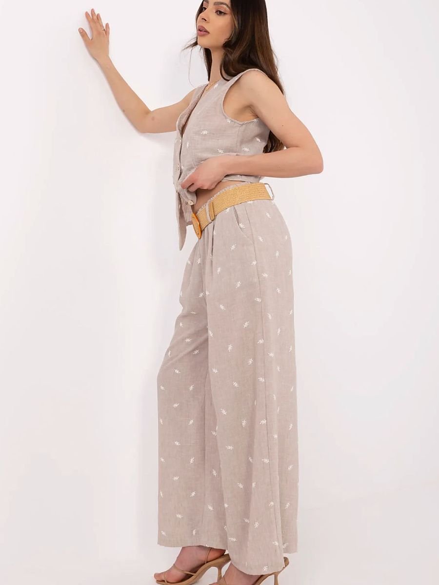 Stylowy komplet damski w casualowym wydaniu, który doskonale sprawdzi się zarówno na co dzień, jak i w pracy. Składa się z dopasowanej kamizelki oraz spodni z szerokimi nogawkami, tworząc modną i wygodną całość z subtelnym, eleganckim akcentem. Kamizelka bez rękawów zapinana na guziki ma klasyczny dekolt w serek, który pięknie podkreśla linię szyi. Wzbogacona o dekoracyjny haft oraz pasek zapinany w talii, świetnie modeluje sylwetkę i dodaje stylizacji oryginalności. Spodnie z wysokim stanem i szerokimi nogawkami wydłużają optycznie nogi, a wsuwane kieszenie boczne zapewniają praktyczność bez rezygnowania z eleganckiego wyglądu. Wykonany z elastycznego materiału, połączenia poliestru i elastanu, komplet gwarantuje wygodę noszenia przez cały dzień, zachowując przy tym modny, dopracowany look.