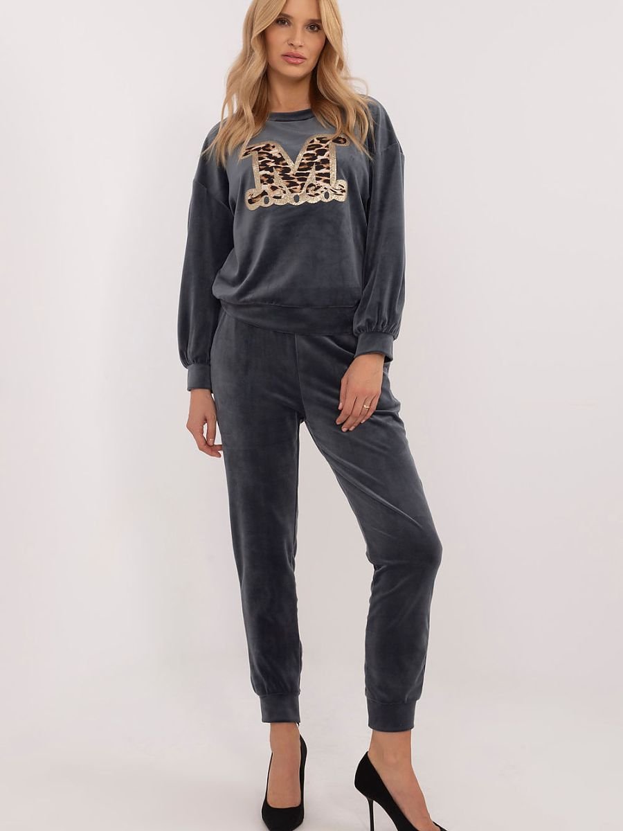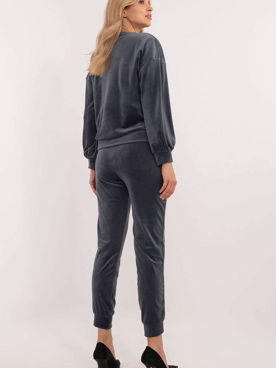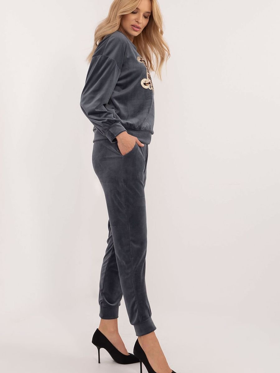 Welurowy komplet damski, składający się z bluzy i spodni, idealny na codzienne okazje, w tym do pracy, w casualowym stylu. Wykonany z miękkiej mieszanki wiskozy i elastanu, zapewnia komfort noszenia oraz swobodę ruchów. Bluza z nadrukiem na przodzie dodaje nowoczesnego, modnego akcentu, a okrągły dekolt i długi rękaw podkreślają klasyczny, wygodny fason. Spodnie mają wysoki stan, który podkreśla sylwetkę, oraz długie nogawki zakończone ściągaczami, co nadaje całości sportowego charakteru. Wsuwane boczne kieszenie to praktyczny dodatek, idealny na codzienne drobiazgi. Ten welurowy komplet to doskonałe połączenie stylu i wygody, które świetnie sprawdzi się zarówno na co dzień, jak i w bardziej casualowych sytuacjach.
