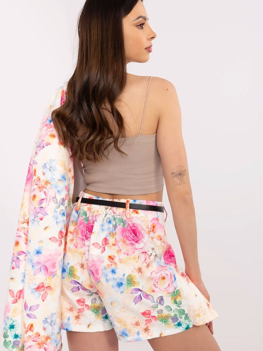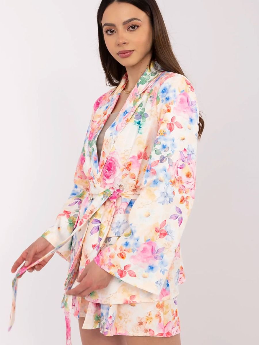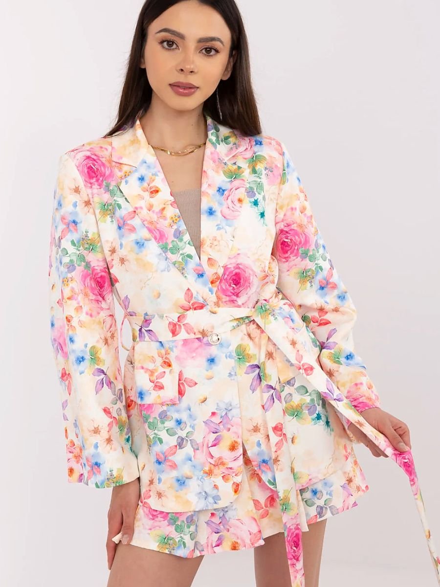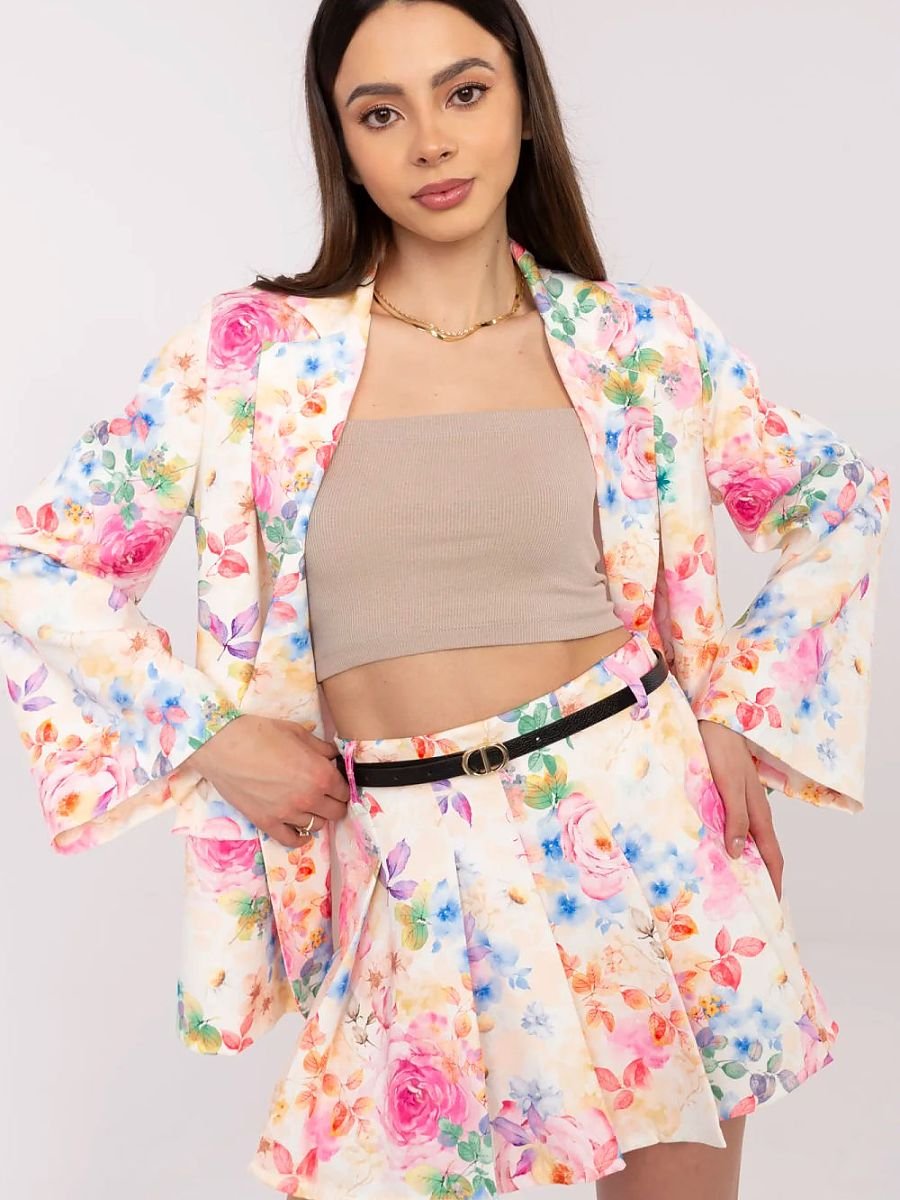 Kobiecy i pełen klasy komplet damski składający się z marynarki oraz spódnicospodenek to idealna propozycja na każdą okazję od codziennego wyjścia, przez pracę, aż po eleganckie przyjęcie. Kwiatowy wzór nadaje zestawowi subtelnej świeżości, a elegancki krój podkreśla sylwetkę. Marynarka z długim rękawem, wykładanymi klapami i zapięciem na guzik została wzbogacona o wszyte poduszki na ramionach, które pięknie modelują linię barków. Dołączony pasek do wiązania pozwala dopasować ją do figury i dodać stylizacji indywidualnego charakteru. Spódnicospodenki z wysokim stanem łączą kobiecy wygląd spódnicy z wygodą szortów. Plisowany przód oraz elegancki pasek zapinany w talii tworzą efektowny akcent i wysmuklają sylwetkę. Brak kieszeni nadaje całości lekkości i eleganckiego wykończenia. Wykonany z połączenia poliestru i elastanu komplet zapewnia komfort noszenia i doskonały wygląd przez cały dzień.