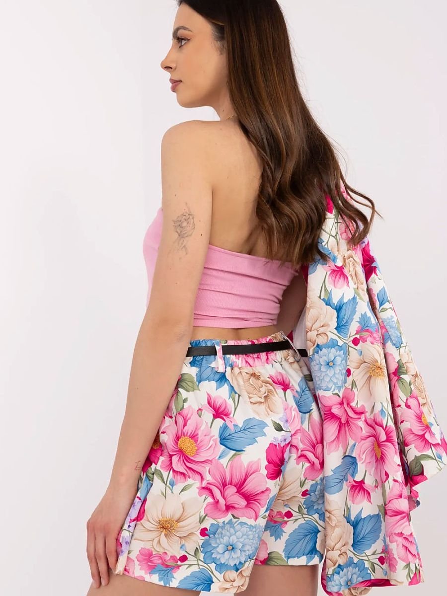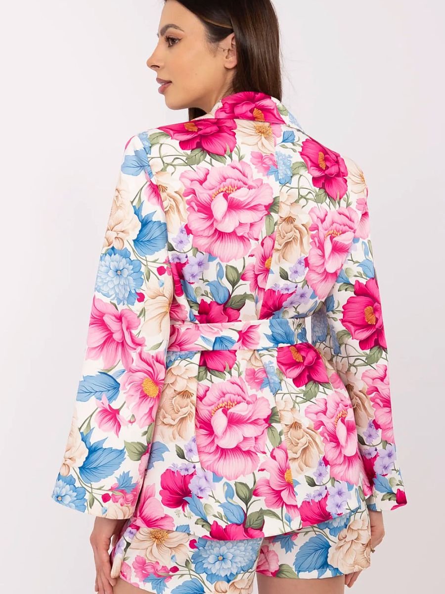 Kobiecy i pełen klasy komplet damski składający się z marynarki oraz spódnicospodenek to idealna propozycja na każdą okazję od codziennego wyjścia, przez pracę, aż po eleganckie przyjęcie. Kwiatowy wzór nadaje zestawowi subtelnej świeżości, a elegancki krój podkreśla sylwetkę. Marynarka z długim rękawem, wykładanymi klapami i zapięciem na guzik została wzbogacona o wszyte poduszki na ramionach, które pięknie modelują linię barków. Dołączony pasek do wiązania pozwala dopasować ją do figury i dodać stylizacji indywidualnego charakteru. Spódnicospodenki z wysokim stanem łączą kobiecy wygląd spódnicy z wygodą szortów. Plisowany przód oraz elegancki pasek zapinany w talii tworzą efektowny akcent i wysmuklają sylwetkę. Brak kieszeni nadaje całości lekkości i eleganckiego wykończenia. Wykonany z połączenia poliestru i elastanu komplet zapewnia komfort noszenia i doskonały wygląd przez cały dzień.