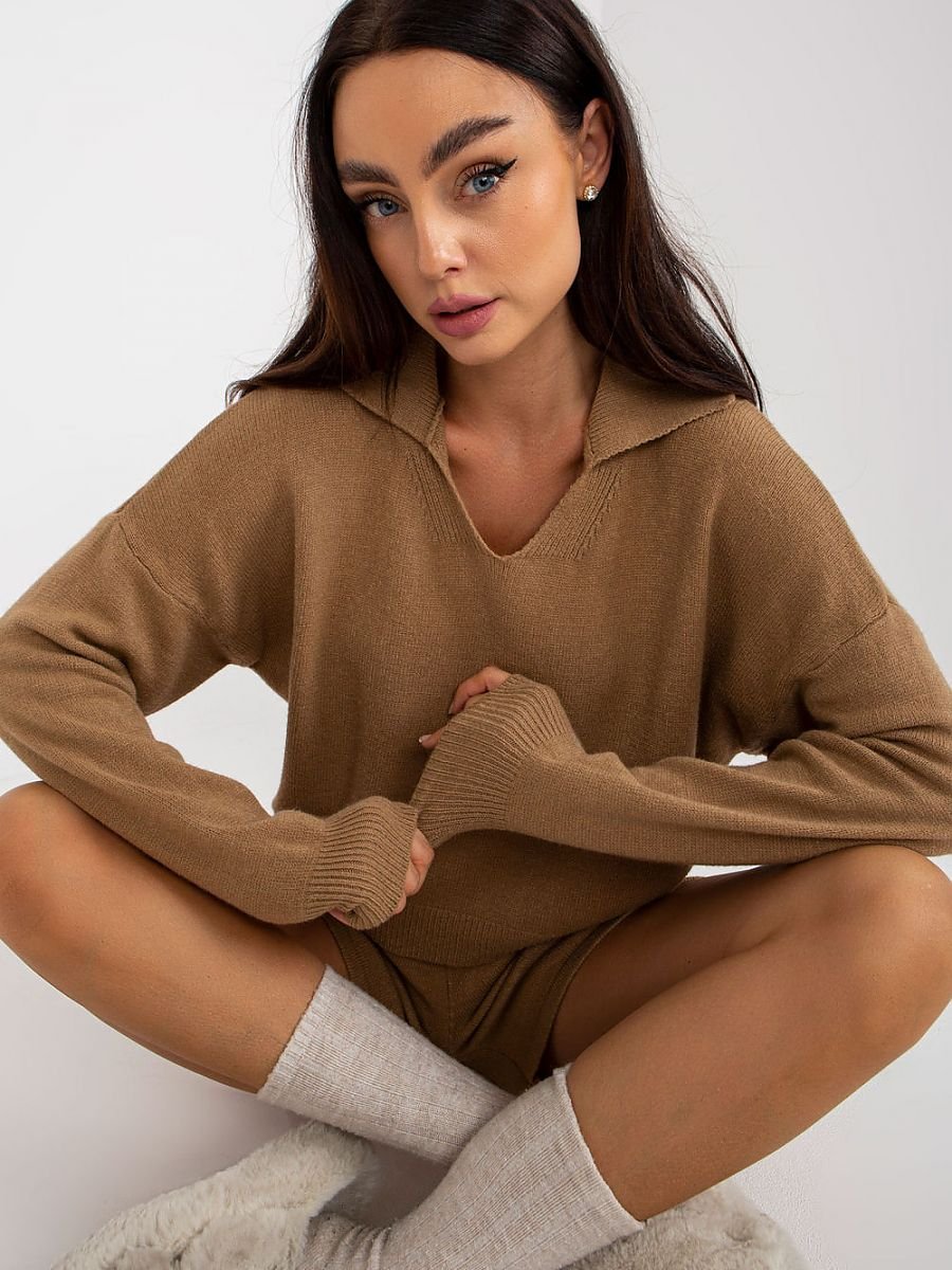 Casualowy komplet składający się z szortów oraz swetra. Sweter o luźniejszym kroju z długim rękawem. Krótkie spodenki z gumką w pasie oraz kieszeniami wsuwanymi.