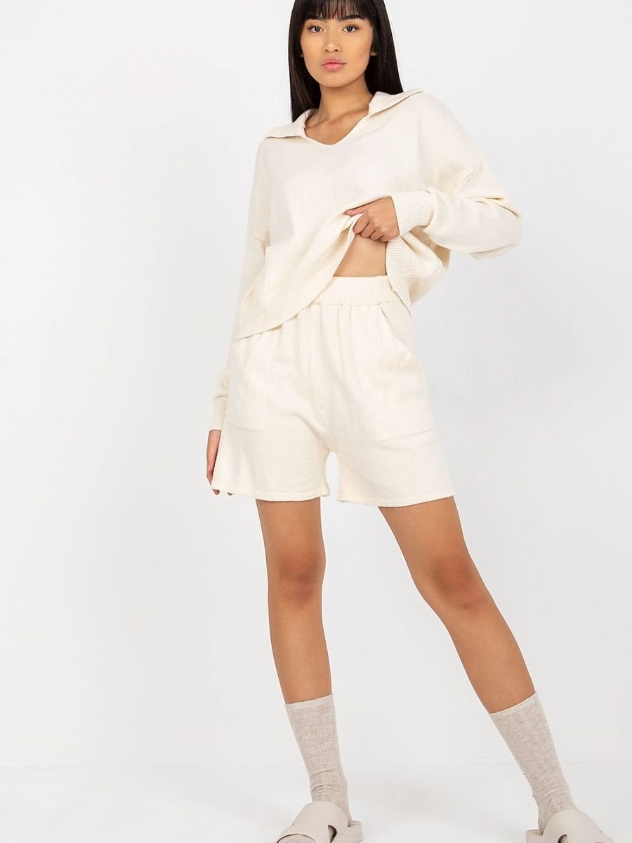 Casualowy komplet składający się z szortów oraz swetra. Sweter o luźniejszym kroju z długim rękawem. Krótkie spodenki z gumką w pasie oraz kieszeniami wsuwanymi.