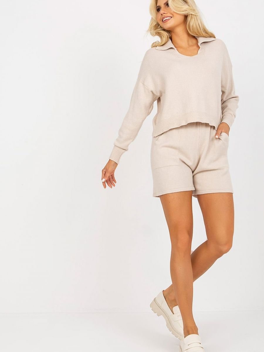 Casualowy komplet składający się z szortów oraz swetra. Sweter o luźniejszym kroju z długim rękawem. Krótkie spodenki z gumką w pasie oraz kieszeniami wsuwanymi.
