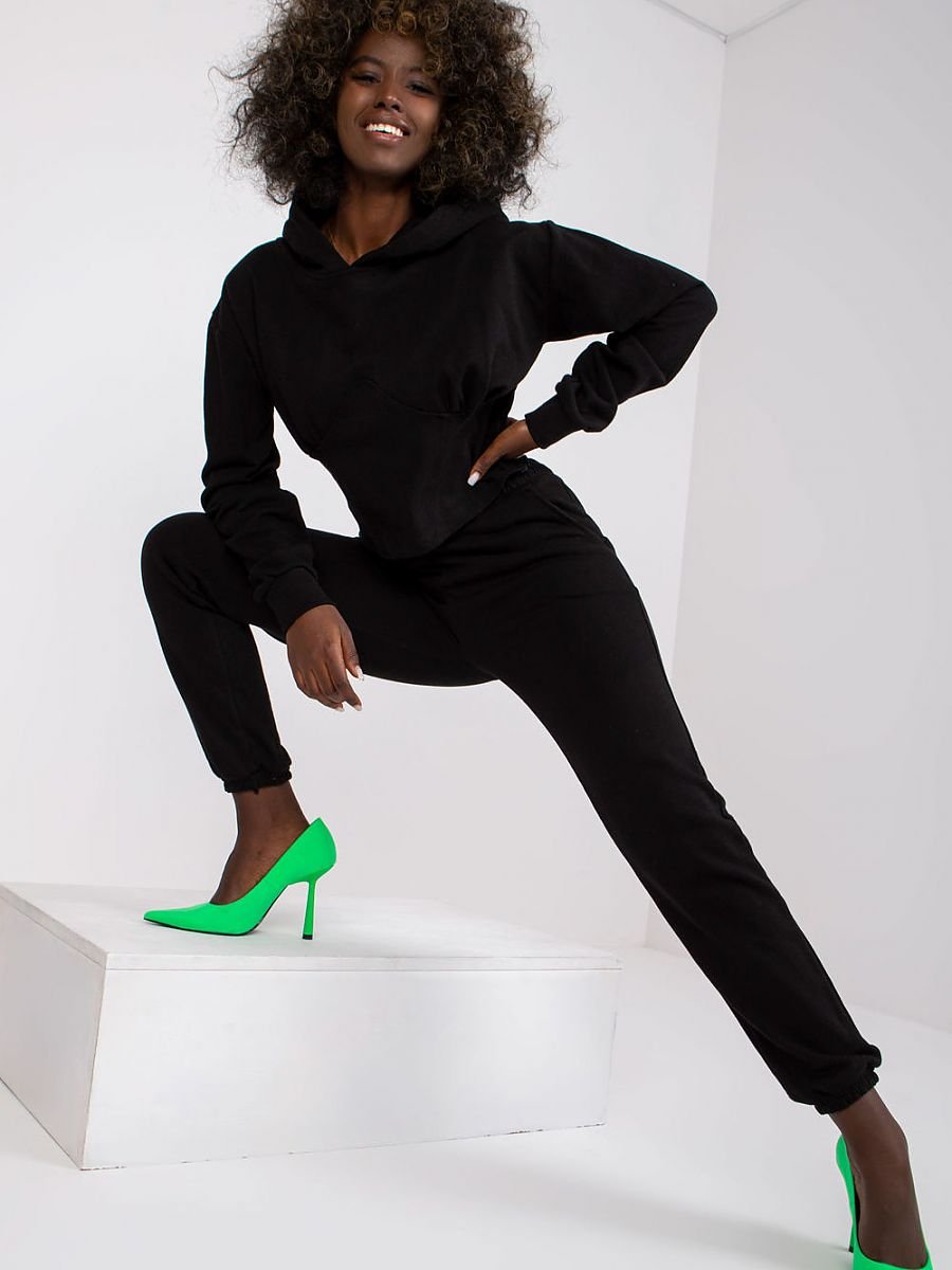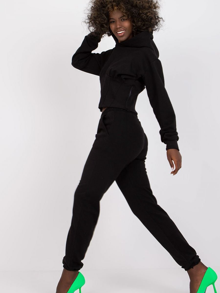 Komplet dresowy składający się z bluzy oraz długich spodni. Bluza z długim rękawem, na przodzie przeszycia, wstawka gorsetowa. Bluza z kapturem, na boku zamek. Spodnie dresowe z gumą w pasie, po bokach kieszenie wsuwane.