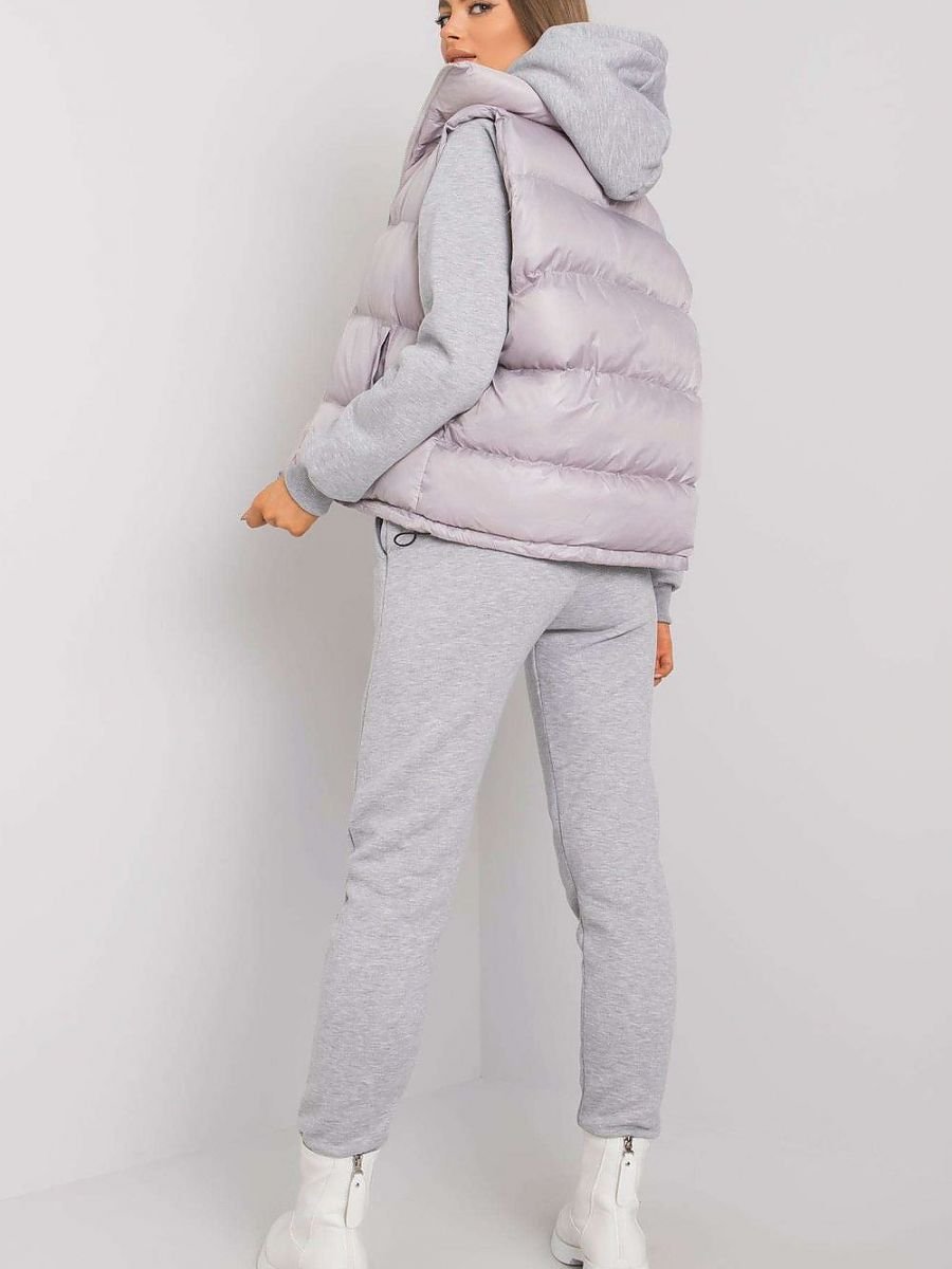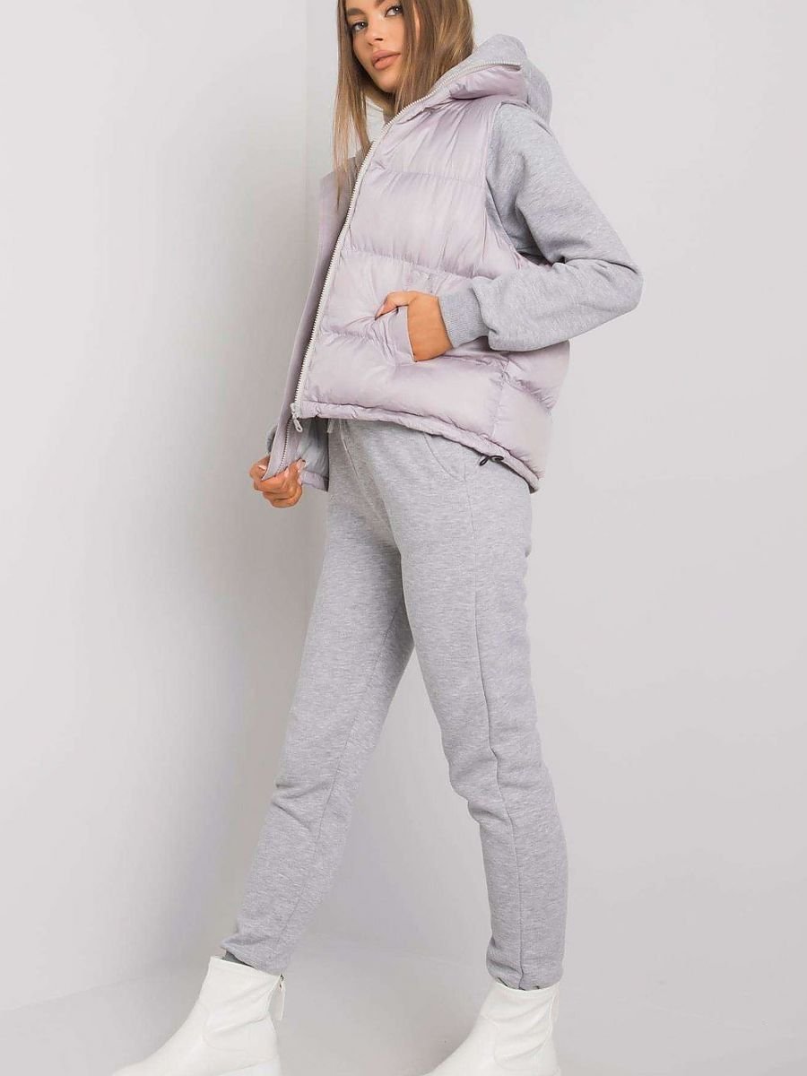 Komplet składający się z bluzy, spodni dresowych i puchowej kamizelki. Kamizelka zapinana na zamek z kieszeniami. Bluza o prostym kroju z długim rękawem i kapturem. Spodnie dresowe z kieszeniami i wiązaniem w pasie.