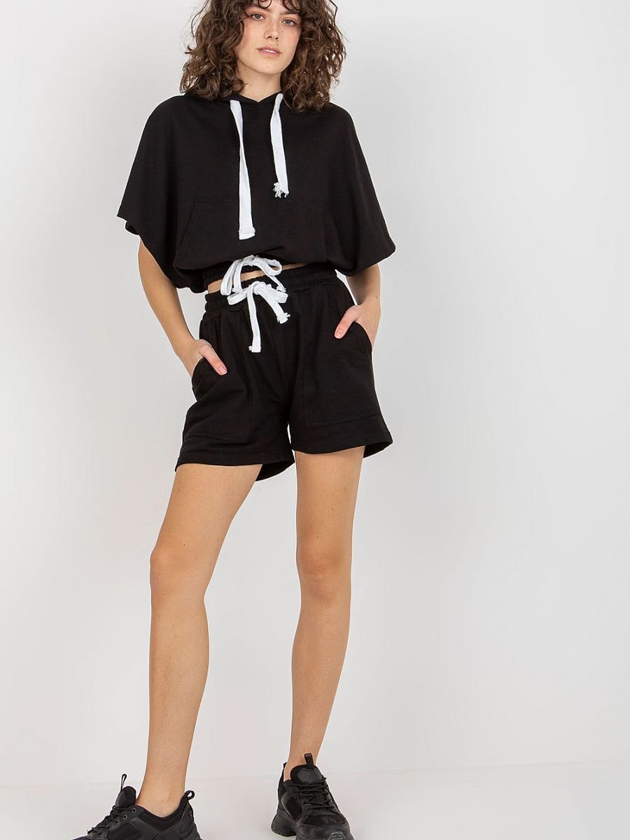 Komplet dresowy składający się z bluzki oraz spodenek. Bluzka z krótkim szerokim rękawkiem, kapturem oraz kieszonka typu kangurek. Szorty z wiązaniem w pasie oraz kieszeniami wsuwanymi.
