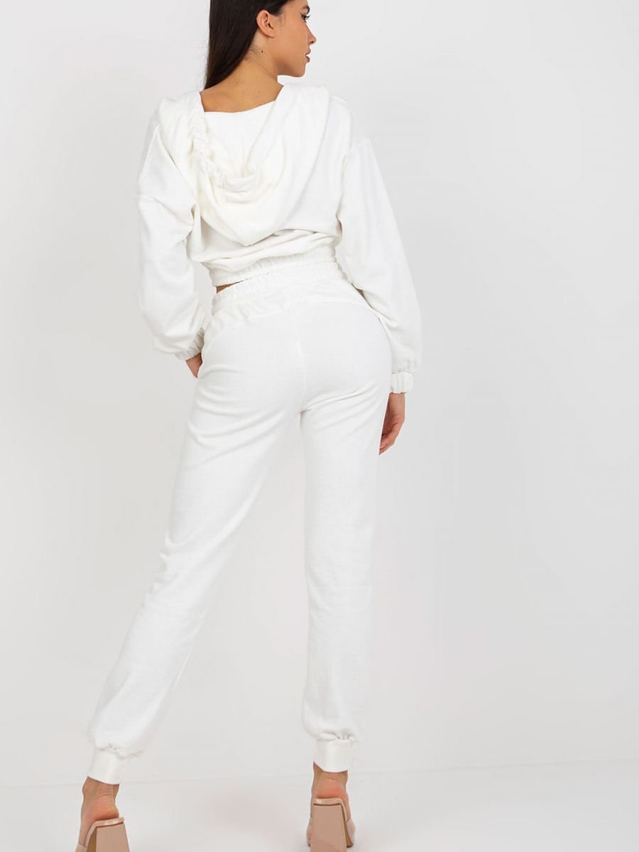 Dresowy komplet składający się z bluzy oraz spodni. Krótka bluza z długim rękawem, kapturem oraz kopertowym dekoltem. Długie spodnie z wiązaniem w pasie oraz kieszeniami wsuwanymi.