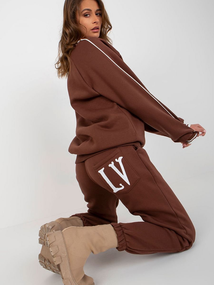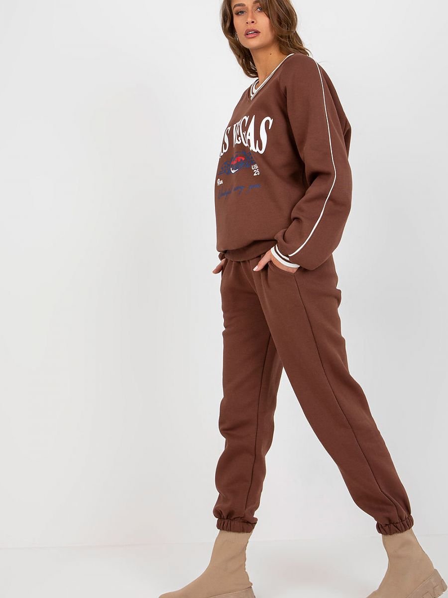 Komplet dresowy składający się z bluzy i spodni. Bluza z długim rękawem oraz dekoltem w serek. Długie spodnie z wiązaniem w pasie oraz kieszeniami wsuwanymi.