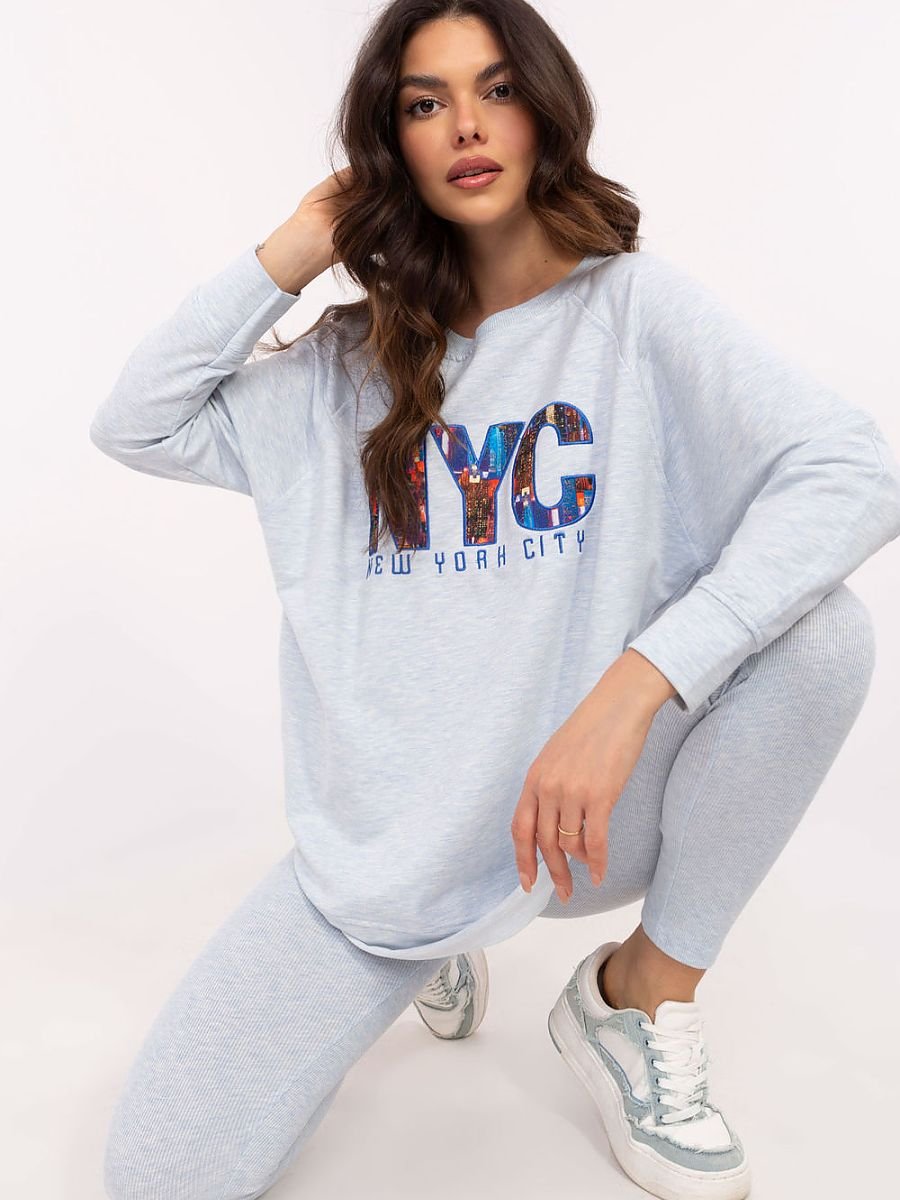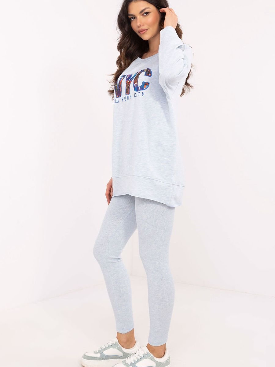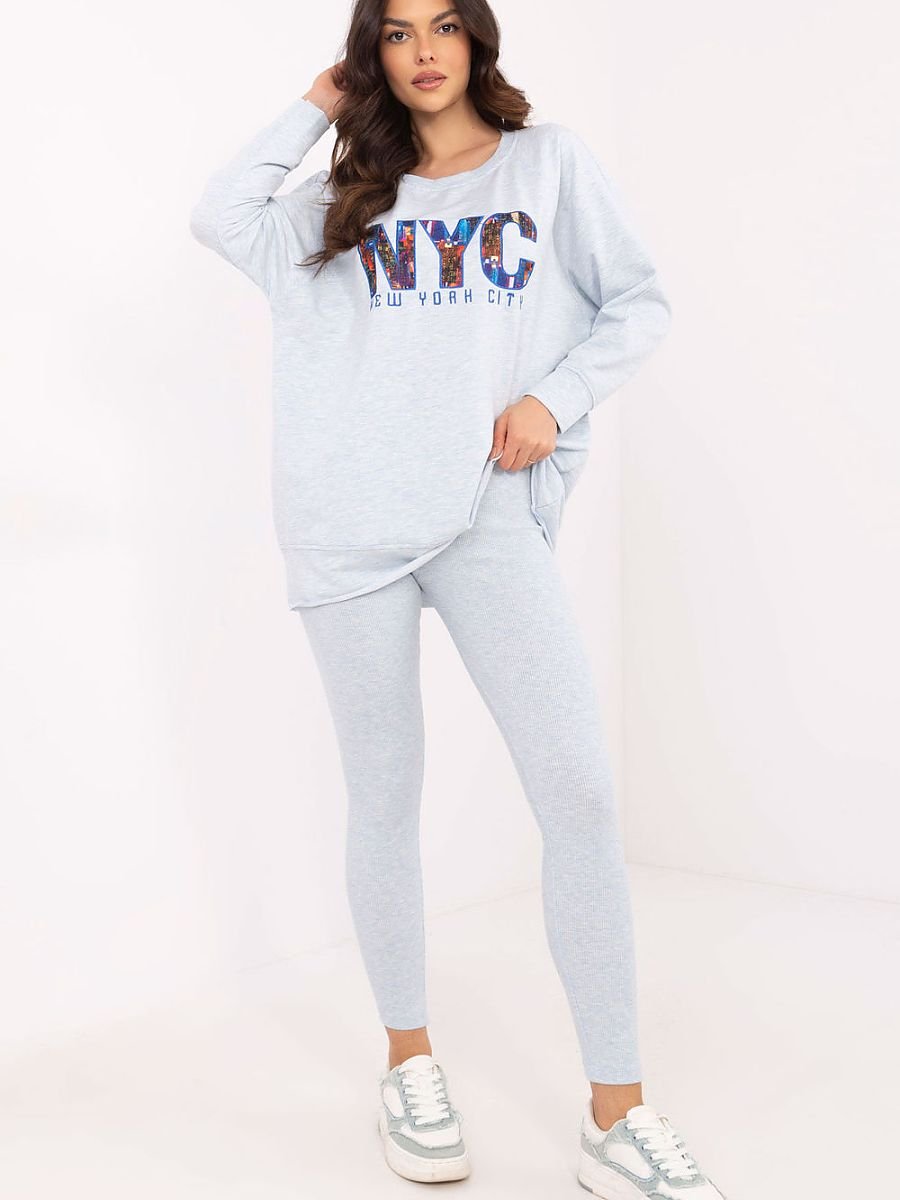 Komplet damski składający się z bluzy oraz legginsów to idealne połączenie wygody i stylu. Bluza posiada nadruk na przodzie, który nadaje jej unikalnego charakteru i podkreśla nowoczesny design. Wykonana z mieszanki wysokiej jakości bawełny, poliestru i elastanu, zapewnia komfort noszenia oraz trwałość. Legginsy wyróżniają się wysokim stanem, co doskonale podkreśla talię i zapewnia wygodę podczas codziennych aktywności. Zwężane nogawki idealnie dopasowują się do sylwetki, a prążkowany materiał dodaje całości subtelnej tekstury i modnego wyglądu. Komplet doskonale sprawdzi się podczas codziennych wyjść, spacerów czy chwil relaksu w domu. Połączenie uniwersalnego stylu z funkcjonalnością czyni go świetnym wyborem na każdą porę roku.