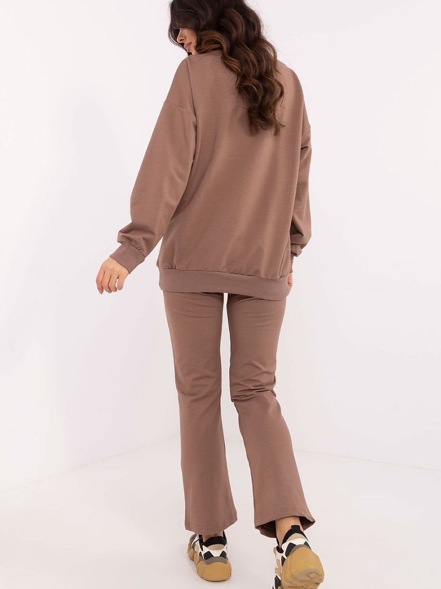 Ten komplet damski to idealny wybór na co dzień, łączący wygodę z minimalistycznym stylem. Składa się z bluzy z długim rękawem i kopertowym dekoltem w serek, który dodaje całości kobiecego akcentu. Subtelna naszywka na bluzie stanowi modny detal, który przyciąga uwagę. Spodnie o prostym kroju, z wysokim stanem i szeroką gumą w pasie, zapewniają doskonałe dopasowanie i komfort noszenia. Wsuwane boczne kieszenie są nie tylko praktyczne, ale też podkreślają swobodny charakter kompletu. Całość wykonana z miękkiej mieszanki bawełny, elastanu i poliestru, co gwarantuje wygodę i trwałość. Komplet świetnie sprawdzi się na spacery, zakupy czy relaks w domu, a jego uniwersalny design pozwala na łatwe dopasowanie do różnych okazji.