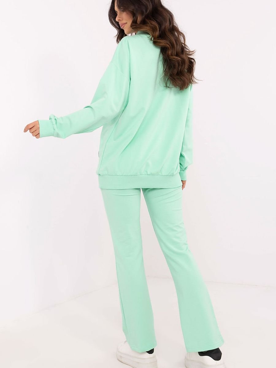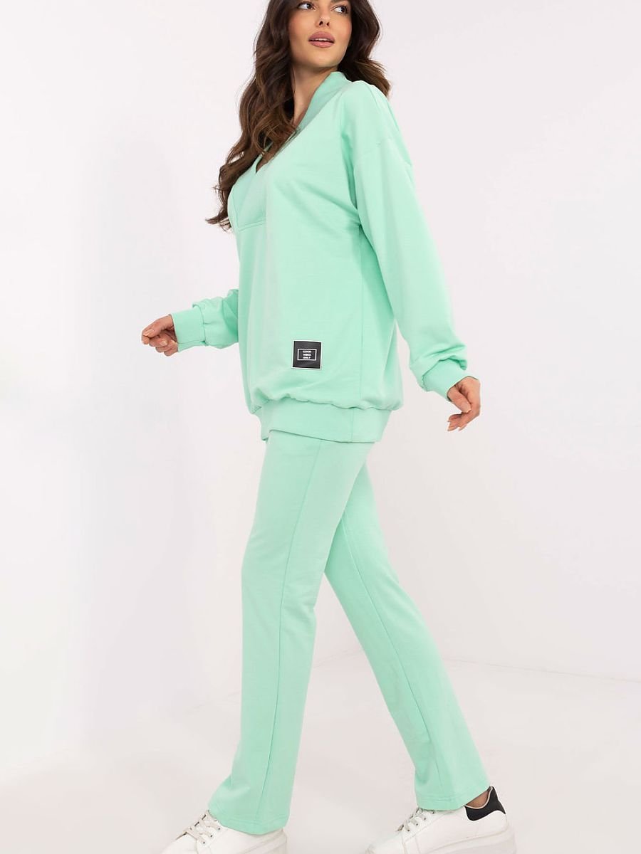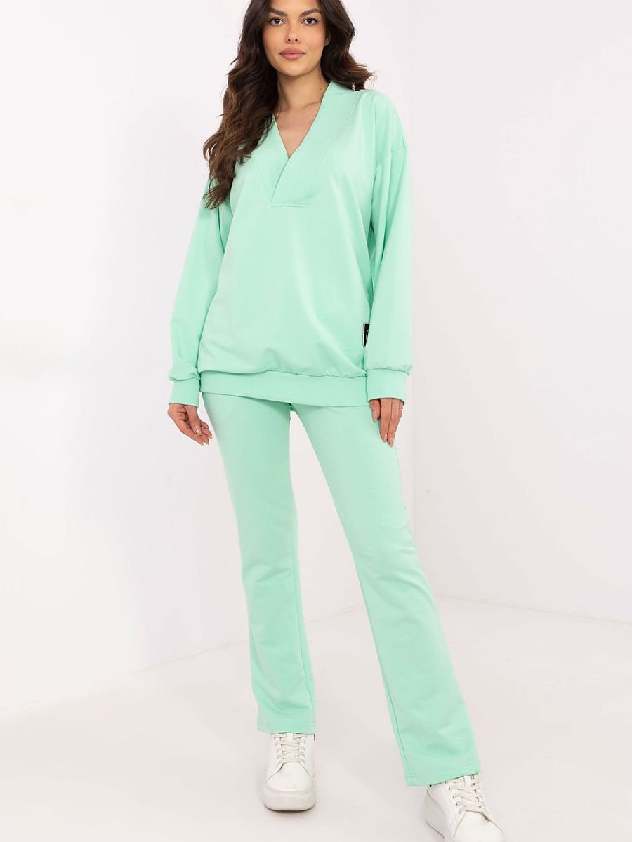 Ten komplet damski to idealny wybór na co dzień, łączący wygodę z minimalistycznym stylem. Składa się z bluzy z długim rękawem i kopertowym dekoltem w serek, który dodaje całości kobiecego akcentu. Subtelna naszywka na bluzie stanowi modny detal, który przyciąga uwagę. Spodnie o prostym kroju, z wysokim stanem i szeroką gumą w pasie, zapewniają doskonałe dopasowanie i komfort noszenia. Wsuwane boczne kieszenie są nie tylko praktyczne, ale też podkreślają swobodny charakter kompletu. Całość wykonana z miękkiej mieszanki bawełny, elastanu i poliestru, co gwarantuje wygodę i trwałość. Komplet świetnie sprawdzi się na spacery, zakupy czy relaks w domu, a jego uniwersalny design pozwala na łatwe dopasowanie do różnych okazji.