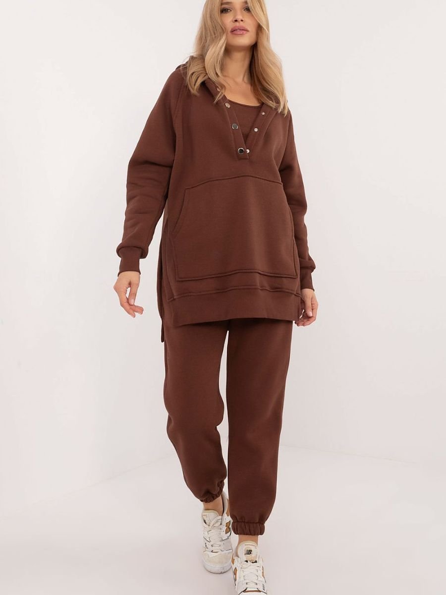 Ocieplany damski komplet w stylu casual, idealny na chłodniejsze dni i codzienne wyjścia, składa się z koszulki, bluzy oraz spodni. Zestaw wyróżnia się melanżowym wzorem, który dodaje mu wyjątkowego charakteru. Wykonany głównie z bawełny, zapewnia komfort i ciepło, idealne na jesienne i zimowe dni. Spodnie mają długie nogawki zakończone ściągaczami oraz wysoki stan, który podkreśla sylwetkę i gwarantuje wygodę noszenia. W pasie znajduje się wiązanie, które umożliwia idealne dopasowanie do figury, a wsuwane boczne kieszenie są praktycznym rozwiązaniem na drobiazgi. Bluza z długim rękawem jest zapinana na napy do połowy, co dodaje jej oryginalności i ułatwia zakładanie. Posiada również kaptur oraz dużą kieszeń typu kangurek, co nadaje sportowego akcentu i dodatkowej funkcjonalności. Całość uzupełnia klasyczna koszulka, tworząc wygodny i stylowy zestaw, idealny na codzienne stylizacje w chłodniejsze dni.