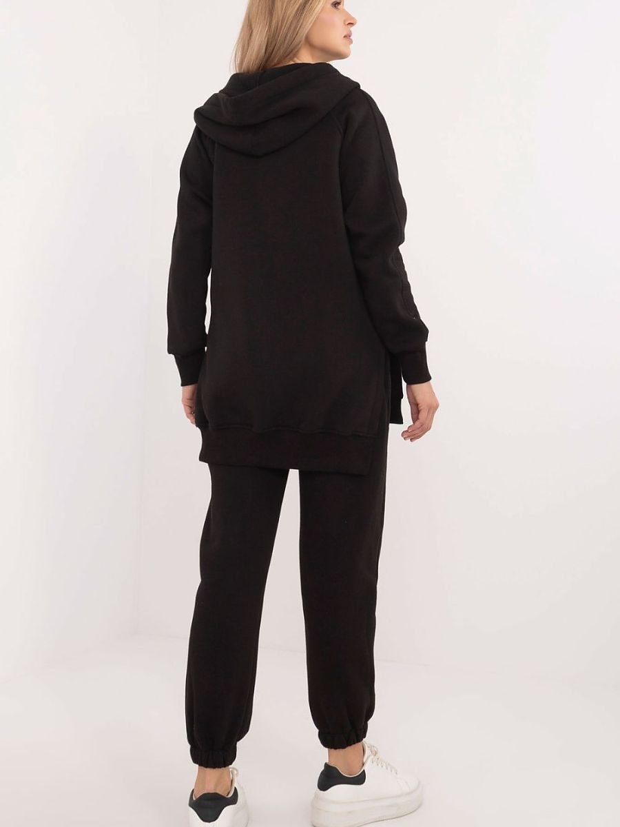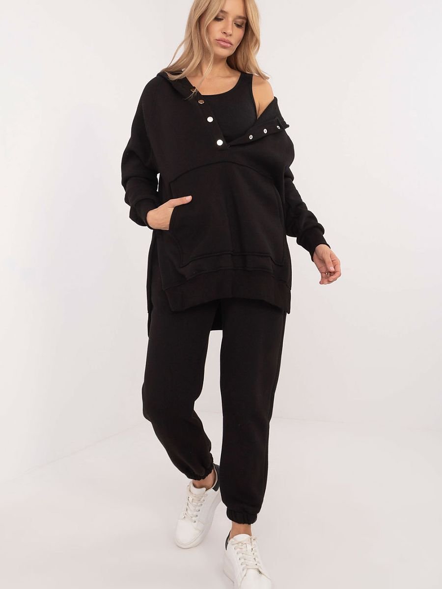 Ocieplany damski komplet w stylu casual, idealny na chłodniejsze dni i codzienne wyjścia, składa się z koszulki, bluzy oraz spodni. Zestaw wyróżnia się melanżowym wzorem, który dodaje mu wyjątkowego charakteru. Wykonany głównie z bawełny, zapewnia komfort i ciepło, idealne na jesienne i zimowe dni. Spodnie mają długie nogawki zakończone ściągaczami oraz wysoki stan, który podkreśla sylwetkę i gwarantuje wygodę noszenia. W pasie znajduje się wiązanie, które umożliwia idealne dopasowanie do figury, a wsuwane boczne kieszenie są praktycznym rozwiązaniem na drobiazgi. Bluza z długim rękawem jest zapinana na napy do połowy, co dodaje jej oryginalności i ułatwia zakładanie. Posiada również kaptur oraz dużą kieszeń typu kangurek, co nadaje sportowego akcentu i dodatkowej funkcjonalności. Całość uzupełnia klasyczna koszulka, tworząc wygodny i stylowy zestaw, idealny na codzienne stylizacje w chłodniejsze dni.