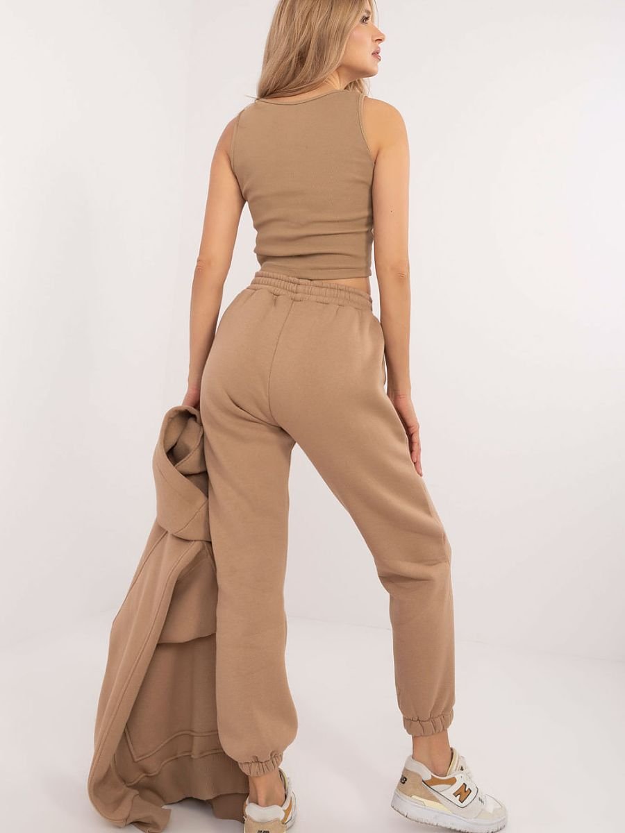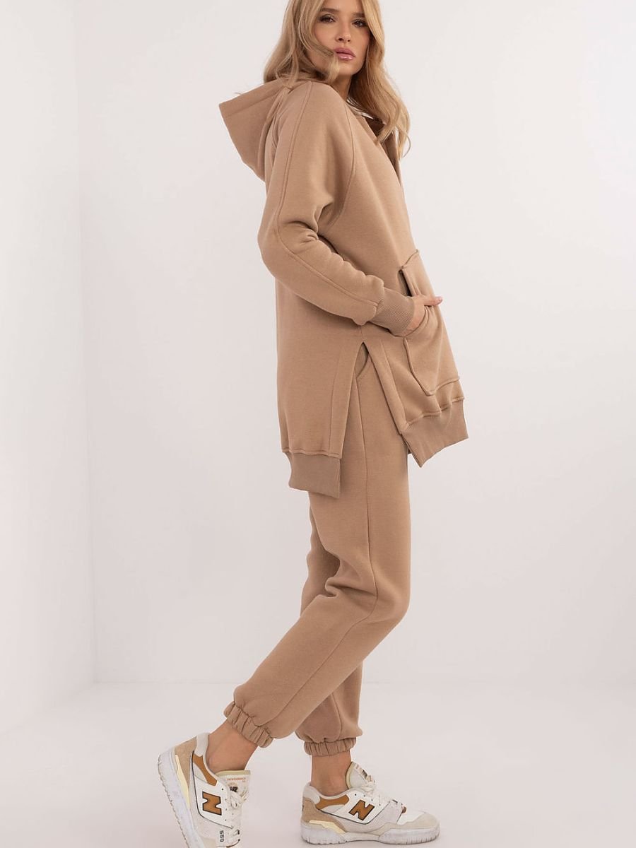 Ocieplany damski komplet w stylu casual, idealny na chłodniejsze dni i codzienne wyjścia, składa się z koszulki, bluzy oraz spodni. Zestaw wyróżnia się melanżowym wzorem, który dodaje mu wyjątkowego charakteru. Wykonany głównie z bawełny, zapewnia komfort i ciepło, idealne na jesienne i zimowe dni. Spodnie mają długie nogawki zakończone ściągaczami oraz wysoki stan, który podkreśla sylwetkę i gwarantuje wygodę noszenia. W pasie znajduje się wiązanie, które umożliwia idealne dopasowanie do figury, a wsuwane boczne kieszenie są praktycznym rozwiązaniem na drobiazgi. Bluza z długim rękawem jest zapinana na napy do połowy, co dodaje jej oryginalności i ułatwia zakładanie. Posiada również kaptur oraz dużą kieszeń typu kangurek, co nadaje sportowego akcentu i dodatkowej funkcjonalności. Całość uzupełnia klasyczna koszulka, tworząc wygodny i stylowy zestaw, idealny na codzienne stylizacje w chłodniejsze dni.