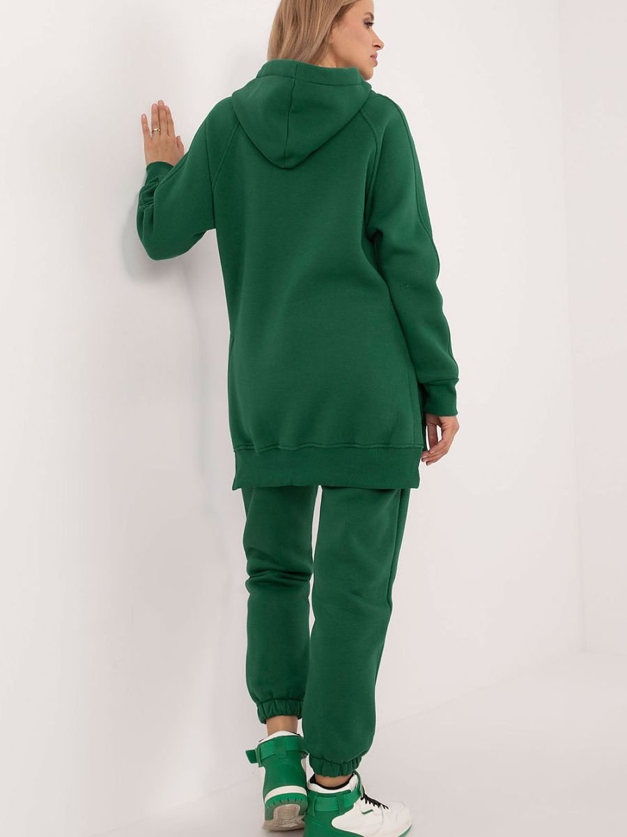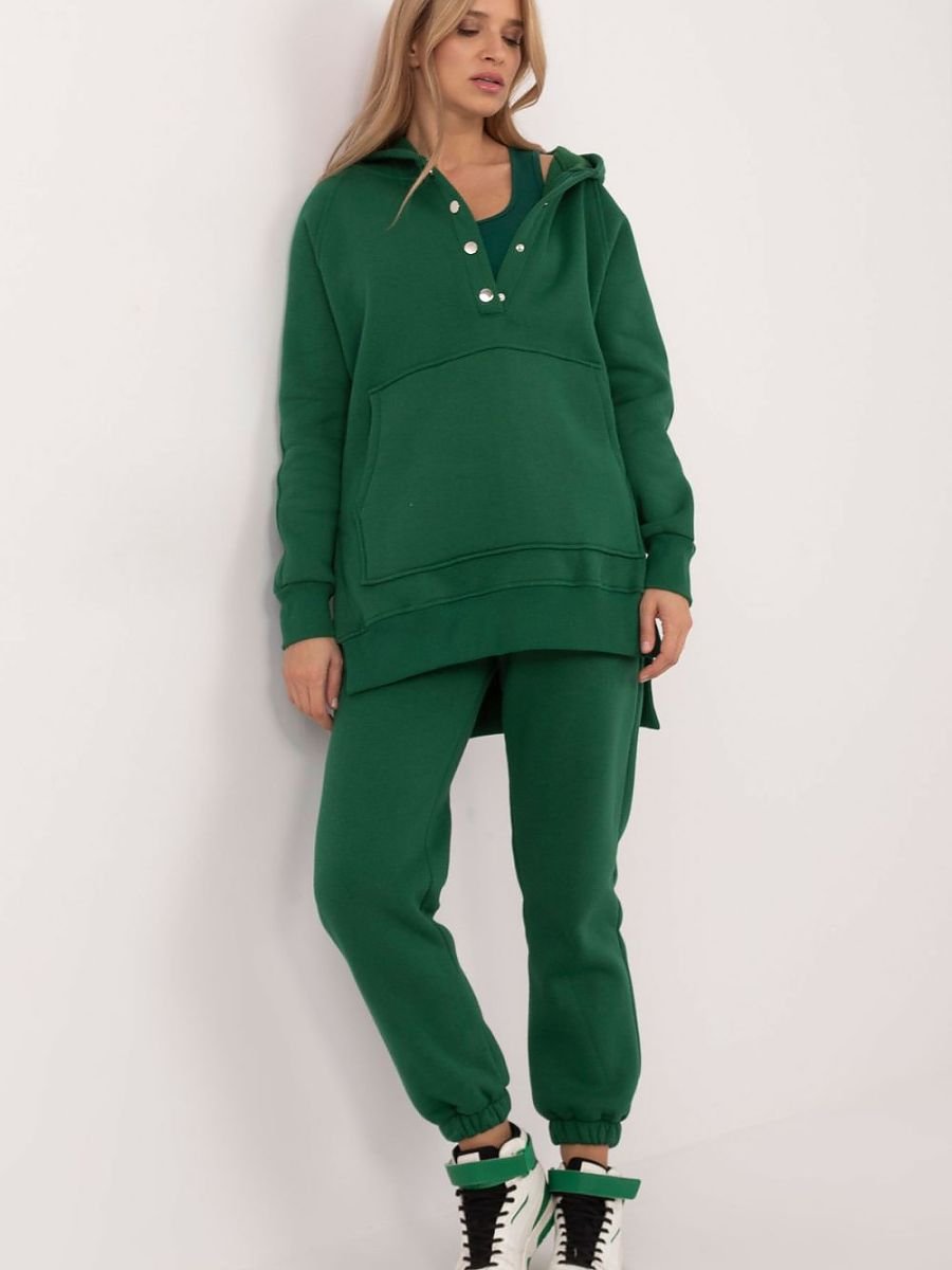 Ocieplany damski komplet w stylu casual, idealny na chłodniejsze dni i codzienne wyjścia, składa się z koszulki, bluzy oraz spodni. Zestaw wyróżnia się melanżowym wzorem, który dodaje mu wyjątkowego charakteru. Wykonany głównie z bawełny, zapewnia komfort i ciepło, idealne na jesienne i zimowe dni. Spodnie mają długie nogawki zakończone ściągaczami oraz wysoki stan, który podkreśla sylwetkę i gwarantuje wygodę noszenia. W pasie znajduje się wiązanie, które umożliwia idealne dopasowanie do figury, a wsuwane boczne kieszenie są praktycznym rozwiązaniem na drobiazgi. Bluza z długim rękawem jest zapinana na napy do połowy, co dodaje jej oryginalności i ułatwia zakładanie. Posiada również kaptur oraz dużą kieszeń typu kangurek, co nadaje sportowego akcentu i dodatkowej funkcjonalności. Całość uzupełnia klasyczna koszulka, tworząc wygodny i stylowy zestaw, idealny na codzienne stylizacje w chłodniejsze dni.