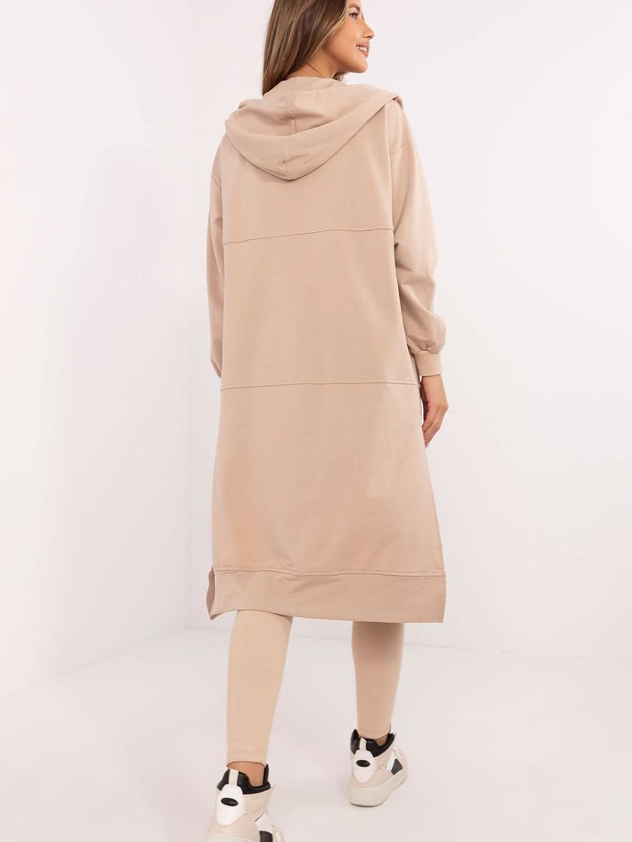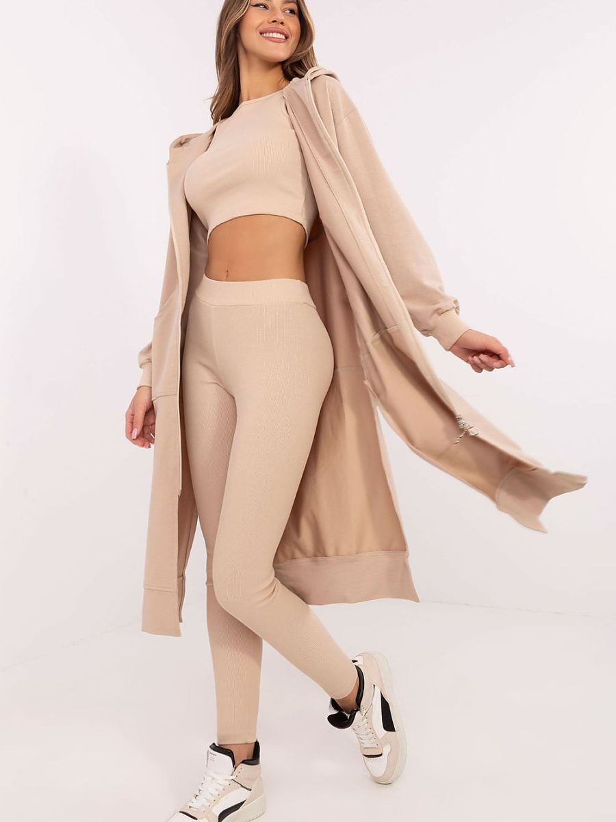 Komplet damski składający się z bluzy, topu i legginsów to harmonijne połączenie stylu casualowego i sportowego. Stworzony z myślą o codziennym komforcie i aktywności, doskonale sprawdzi się zarówno podczas treningu, jak i w trakcie relaksu. Bluza o przedłużonym kroju to praktyczne rozwiązanie na chłodniejsze dni. Zapinana na zamek błyskawiczny i wyposażona w wsuwane kieszenie, zapewnia wygodę i funkcjonalność. Wykonana z mieszanki bawełny, poliestru i elastanu, łączy miękkość z elastycznością. Długi rękaw oraz kaptur dodatkowo chronią przed wiatrem i chłodem. Top o okrągłym dekolcie jest prosty, a zarazem uniwersalny, idealnie dopasowany do całego zestawu. Jego skład z bawełny i elastanu gwarantuje przewiewność i komfort noszenia. Legginsy o zwężanych nogawkach i wysokim stanie podkreślają sylwetkę, jednocześnie zapewniając pełną swobodę ruchu. Wykonane z bawełny i elastanu, cechują się elastycznością i trwałością. Dodatkowym wyróżnikiem jest prążkowana struktura materiału, która nadaje im wyjątkowego charakteru. Całość utrzymana w gładkim wzorze, doskonale wpisuje się w codzienny, sportowy look, oferując zarówno styl, jak i maksymalny komfort użytkowania.