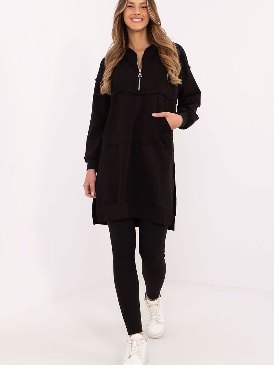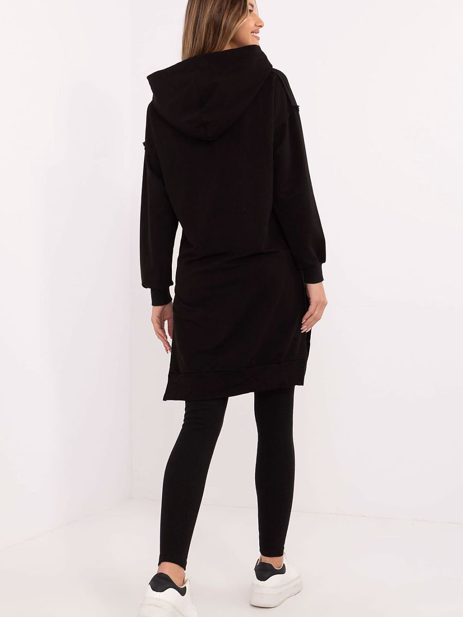 Komplet damski składający się z długiej bluzy i legginsów to idealny wybór na codzienne stylizacje w casualowym stylu. Praktyczny, wygodny i stylowy, doskonale sprawdzi się podczas spacerów, spotkań z przyjaciółmi czy relaksu w domowym zaciszu. Bluza o przedłużonym kroju wykonana z miękkiej i elastycznej mieszanki bawełny i elastanu zapewnia maksymalny komfort noszenia. Wyposażona w obszerny kaptur i długi rękaw, doskonale sprawdza się w chłodniejsze dni. Kieszeń typu kangurek na przodzie dodaje funkcjonalności i casualowego charakteru. Legginsy o zwężanych nogawkach i wysokim stanie podkreślają sylwetkę, jednocześnie gwarantując pełną swobodę ruchu. Wykonane z bawełny z dodatkiem elastanu, idealnie dopasowują się do ciała, zapewniając wygodę przez cały dzień. Komplet utrzymany w gładkim wzorze stanowi harmonijną całość, którą łatwo uzupełnić ulubionymi dodatkami. To doskonałe rozwiązanie dla kobiet ceniących styl i komfort na co dzień.