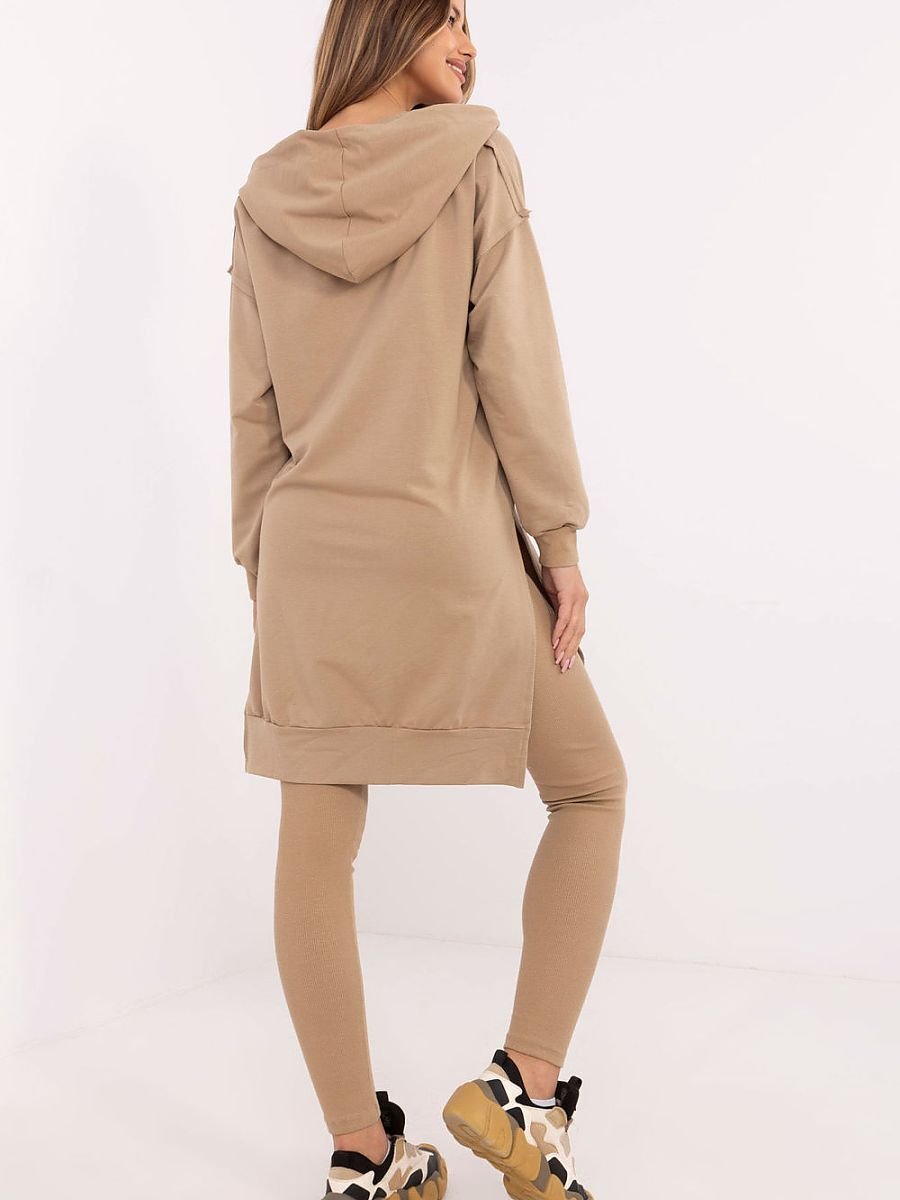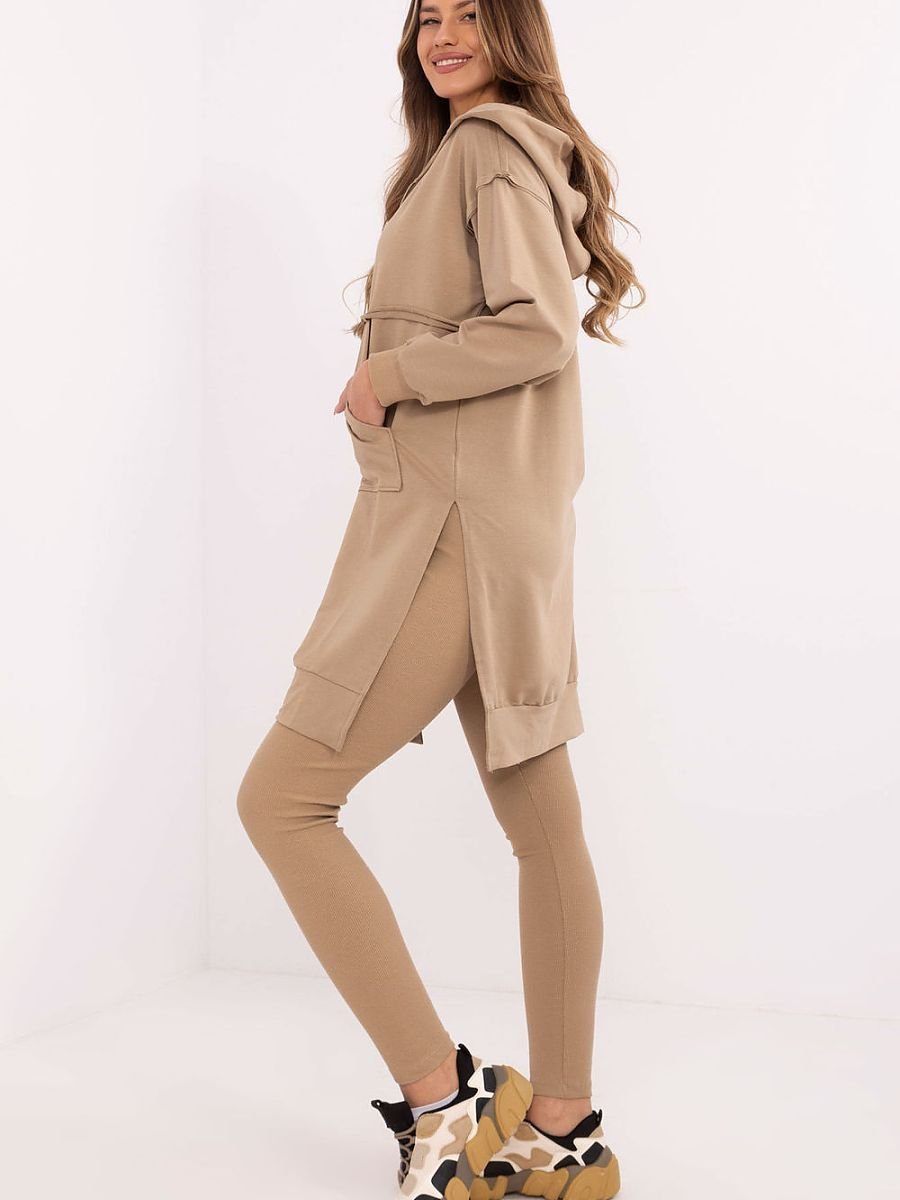 Komplet damski składający się z długiej bluzy i legginsów to idealny wybór na codzienne stylizacje w casualowym stylu. Praktyczny, wygodny i stylowy, doskonale sprawdzi się podczas spacerów, spotkań z przyjaciółmi czy relaksu w domowym zaciszu. Bluza o przedłużonym kroju wykonana z miękkiej i elastycznej mieszanki bawełny i elastanu zapewnia maksymalny komfort noszenia. Wyposażona w obszerny kaptur i długi rękaw, doskonale sprawdza się w chłodniejsze dni. Kieszeń typu kangurek na przodzie dodaje funkcjonalności i casualowego charakteru. Legginsy o zwężanych nogawkach i wysokim stanie podkreślają sylwetkę, jednocześnie gwarantując pełną swobodę ruchu. Wykonane z bawełny z dodatkiem elastanu, idealnie dopasowują się do ciała, zapewniając wygodę przez cały dzień. Komplet utrzymany w gładkim wzorze stanowi harmonijną całość, którą łatwo uzupełnić ulubionymi dodatkami. To doskonałe rozwiązanie dla kobiet ceniących styl i komfort na co dzień.