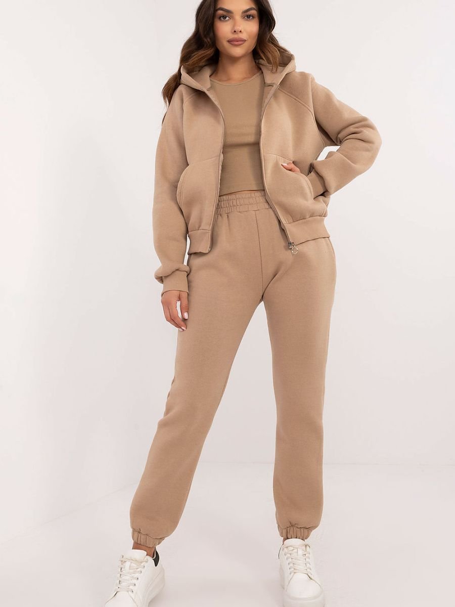 Damski komplet dresowy, idealny na codzienne, casualowe i sportowe stylizacje, wykonany z mieszanki bawełny i elastanu. Zestaw składa się z krótkiej koszulki na ramiączkach, bluzy zapinanej na zamek z kapturem, długimi rękawami i wsuwanymi kieszeniami, oraz spodni o długich nogawkach zakończonych ściągaczami. Spodnie mają wysoki stan i boczne, wsuwane kieszenie dla dodatkowej wygody. Na tyle spodni, na wysokości pośladków, znajduje się subtelny nadruk. Całość utrzymana w melanżowym wzorze, a dodatkowe ocieplenie zapewnia komfort w chłodniejsze dni. To wygodny i stylowy wybór na co dzień. .